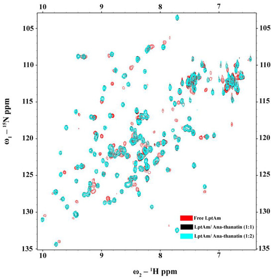 15N-1H HSQC titration of 15N-LptAm in the free form (red contour) and in the presence of Ana-thanatin at molar ratios of 1:1 (black contour) and 1:2 (cyan contour).