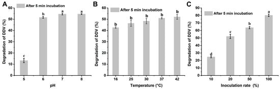 Degradation rate of 20 mg/L DDVP by strain G1 under different pH levels (A), temperatures (B), and inoculation amounts (C) within 5 min. (The data are represented as the mean ± standard deviation for triplicate. A–d letters are marked based on difference significance analysis).