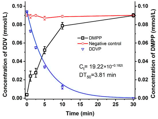 DDVP mainly causes the death of target insects by inhibiting the activity of acetylcholinesterase []. At the same time, this effect is also harmful to mammals. It can be ingested, inhaled, and absorbed through the skin, and can penetrate biological barriers and accumulate in the cytoplasm []. Studies have found that in addition to neurotoxicity, DDVP also has hepatotoxicity, nephrotoxicity, and genotoxicity [,]. Epidemiological studies showed that exposure to DDVP can increase the incidence of liver diseases. In vivo and in vitro model experiments on rats also found that DDVP can affect the ABC transporters and amino acid biosynthesis in rat liver cells []. Furthermore, DDVP can reduce sperm cells in male rats through oxidative stress and cause testicular tissue lesions []. Therefore, finding a rapid degradation method for DDVP residues is of great significance for environmental and ecological risks and human health.