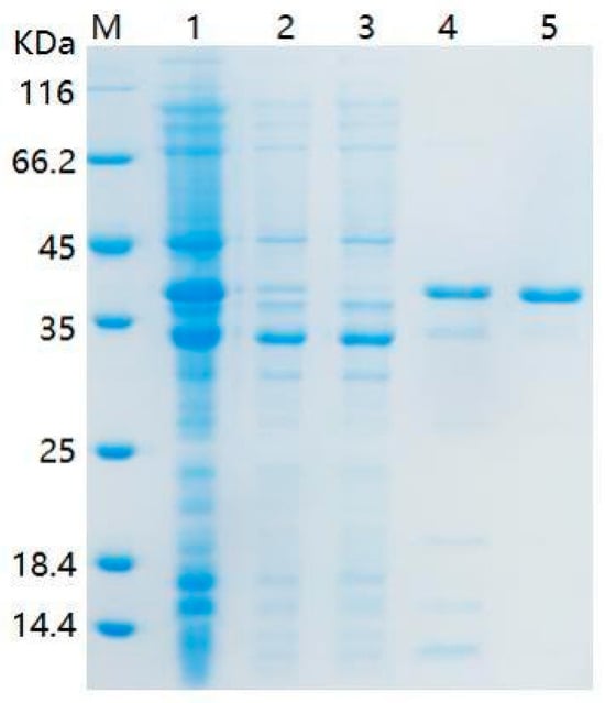 The SDS-Page of crude enzyme and purified MPD. Line M: Marker; Line 1: IPTG induced; Line 2: supernatant; Line 3: effluent; Line 4: 50 mM imidazole eluent; Line 5: 500 mM imidazole eluent.