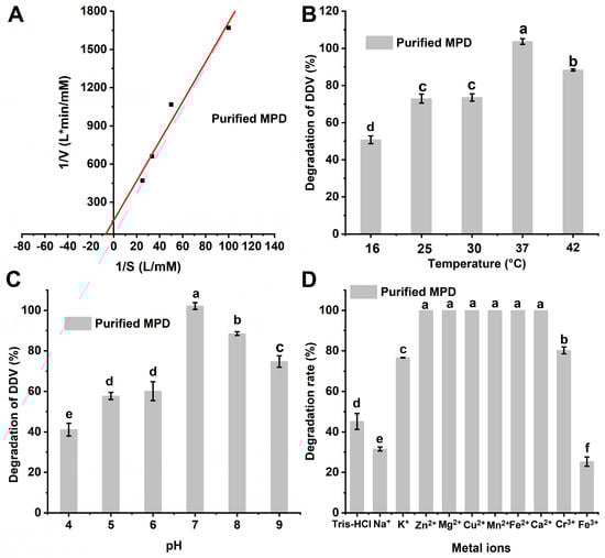 Michaelis constant of enzyme MPD (A); degradation characteristics of enzyme MPD under different temperatures (B), pH levels (C), and metal ions (D). (The data are represented as the mean ± standard deviation for triplicate. a–f letters are marked based on difference significance analysis).