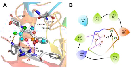 To analyze the degradation and catalytic mechanism of the degrading enzyme MPD on DDVP, we used the AlphaFold2 model to construct the 3D structure of enzyme MPD and determined the binding sites through molecular docking. The results showed that the binding energy between DDVP and MPD was −5.24 kcal/mol (Table 2). DDVP could interact with the active pocket (comprising Ser87, Ala261, Phe264, Asp265, Tyr318, Arg319, and Phe320) in MPD through hydrogen bond and halogen bond (Figure 6). Phe320 and Arg319 formed hydrogen bonds with the O (on the phosphate group) of DDVP, respectively. Try318 formed halogen bonds with the Cl (on the phosphate group) of DDVP.
