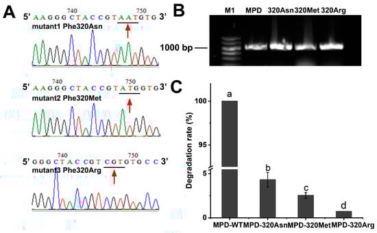 (A) Sequencing chromatogram of the mutants; (B) gel electrophoresis of the mutant Phe320Asn, Phe320Met, and Phe320Arg; and (C) degradation of DDVP via wild-type MPD and mutants. (The data are represented as the mean ± standard deviation for triplicate. a–d letters are marked based on difference significance analysis).
