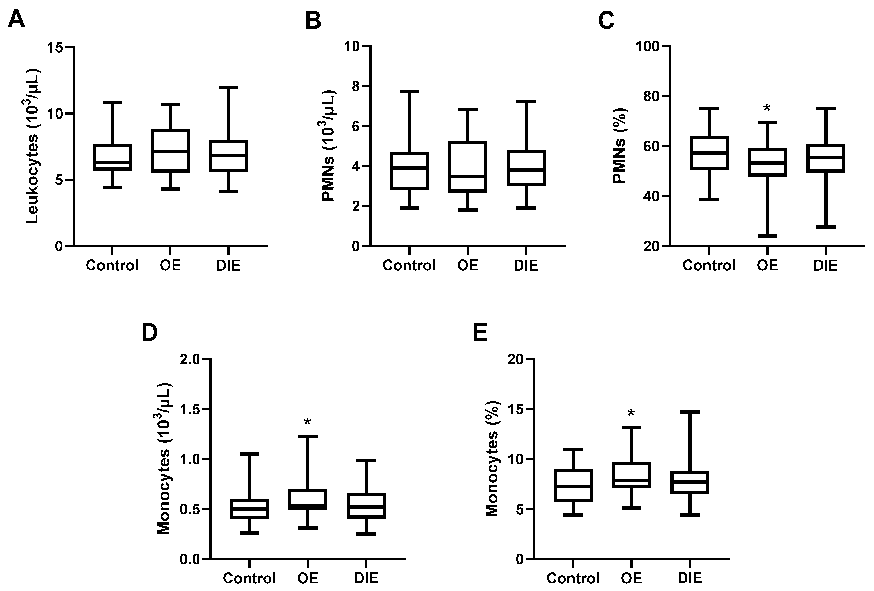 Figure 1). While similar trends were observed in the DIE group, the differences did not reach statistical significance, suggesting that systemic immune alterations may be more pronounced in OE (