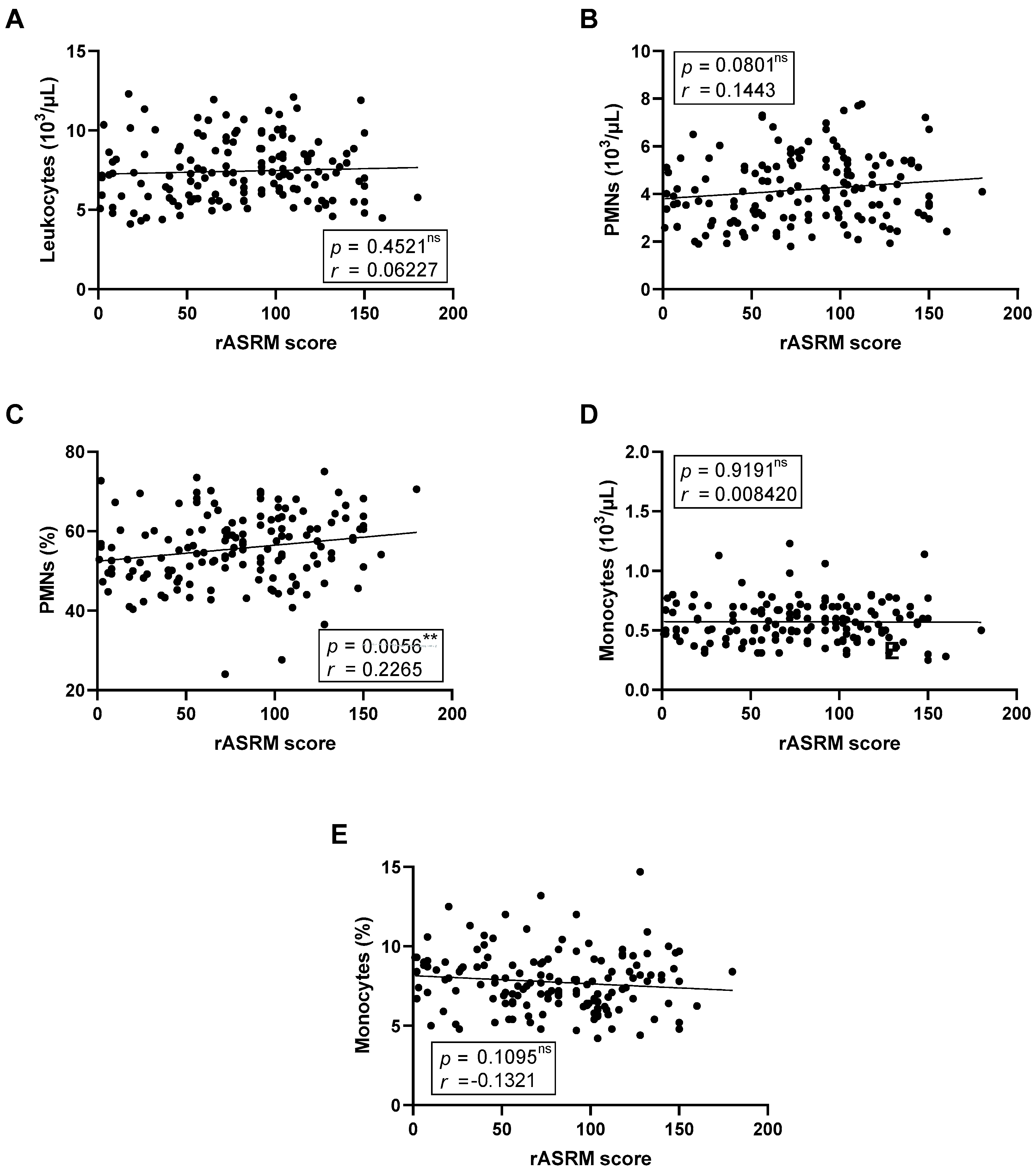 Figure 2). After adjustment for multiple testing using the Benjamini–Hochberg procedure, the positive correlation between rASRM score and the proportion of circulating PMNs remained statistically significant (