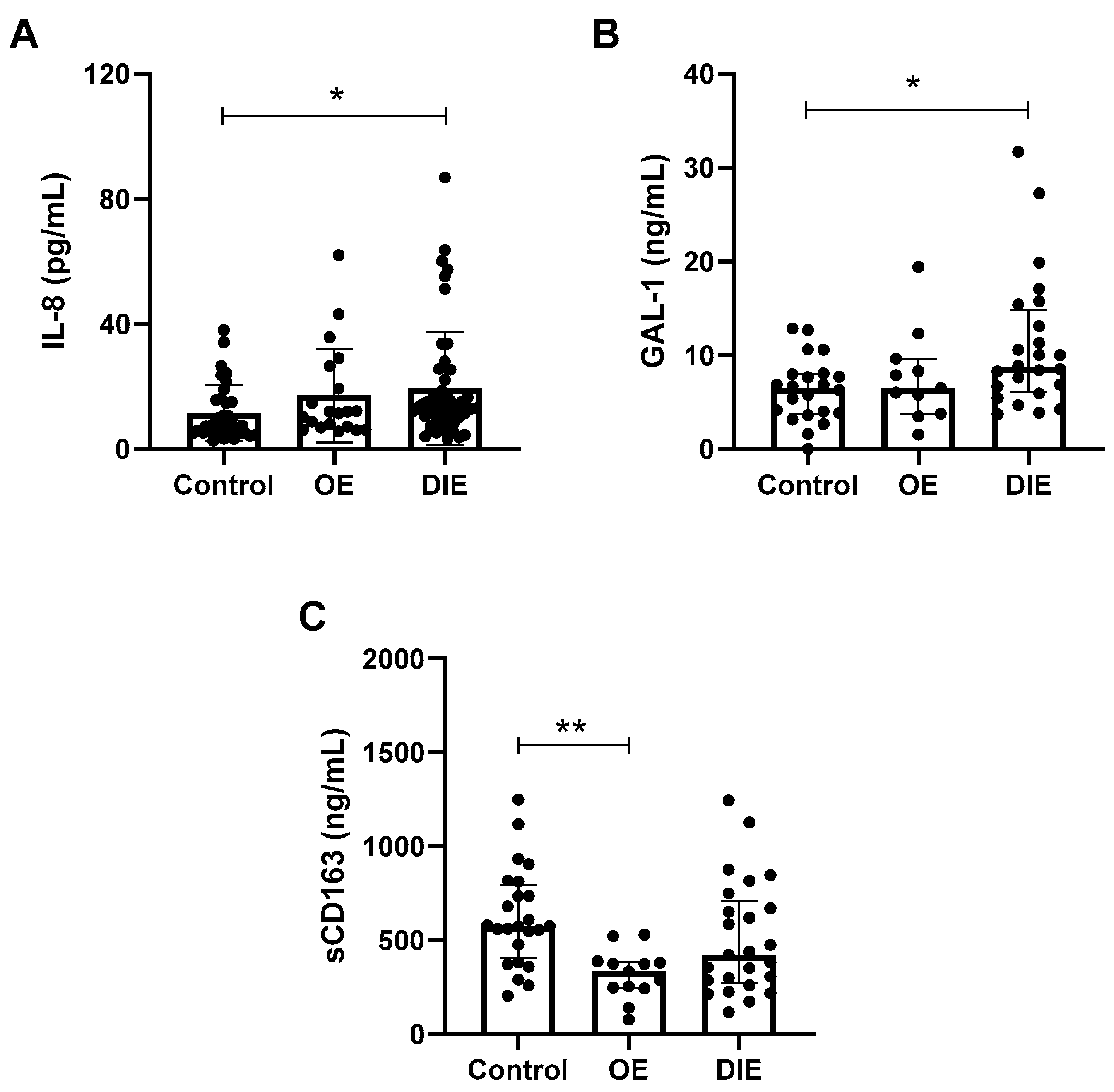 When examining soluble mediators, we identified a distinct profile for each subtype. Patients with DIE exhibited increased IL-8 and GAL-1 levels, suggesting an inflammatory milieu that is partially counterbalanced by immunoregulatory signals. In contrast, OE patients showed reduced plasma sCD163 despite higher circulating monocytes, suggesting impaired monocyte/macrophage regulatory activity. sCD163 is a well-recognized marker of macrophage activation and an anti-inflammatory scavenger receptor [