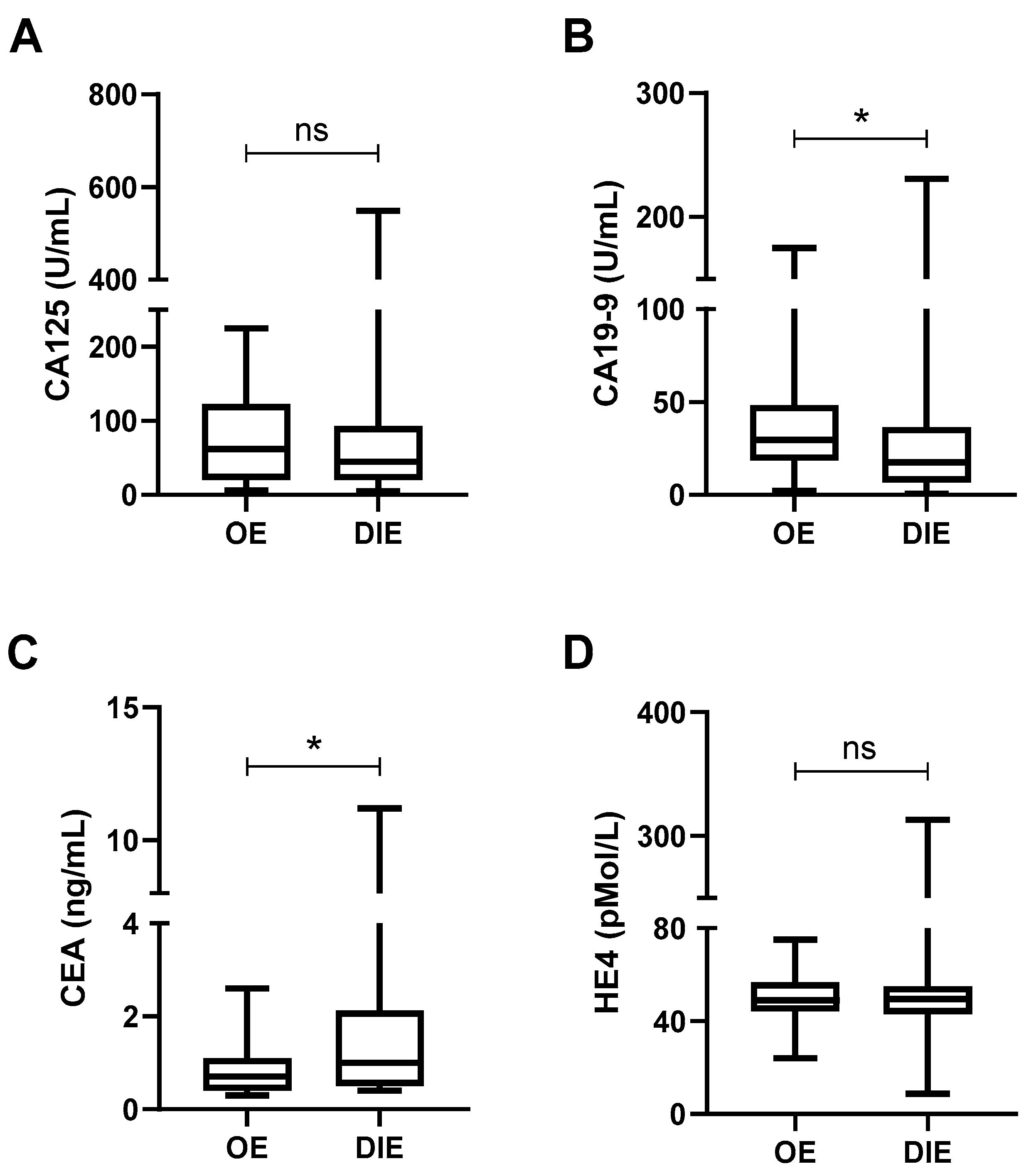 Figure 4B), whereas CEA levels were significantly higher in DIE (1.5 ± 1.6 ng/mL vs. 0.8 ± 0.6 ng/mL,