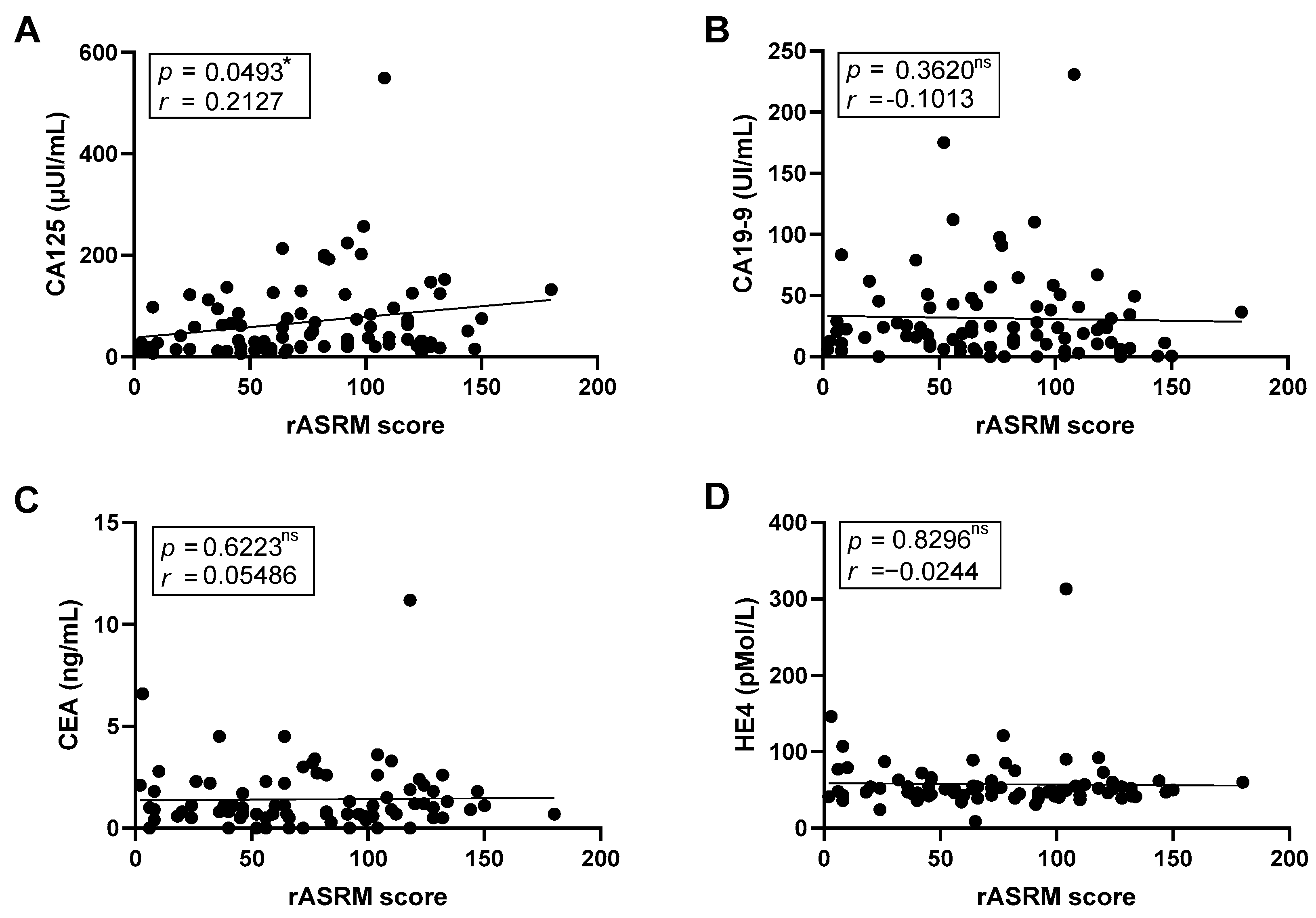 We next investigated the relationship between tumor markers and disease severity assess using the rASRM score. A nominal positive correlation between CA125 levels and the rASRM score was found (
