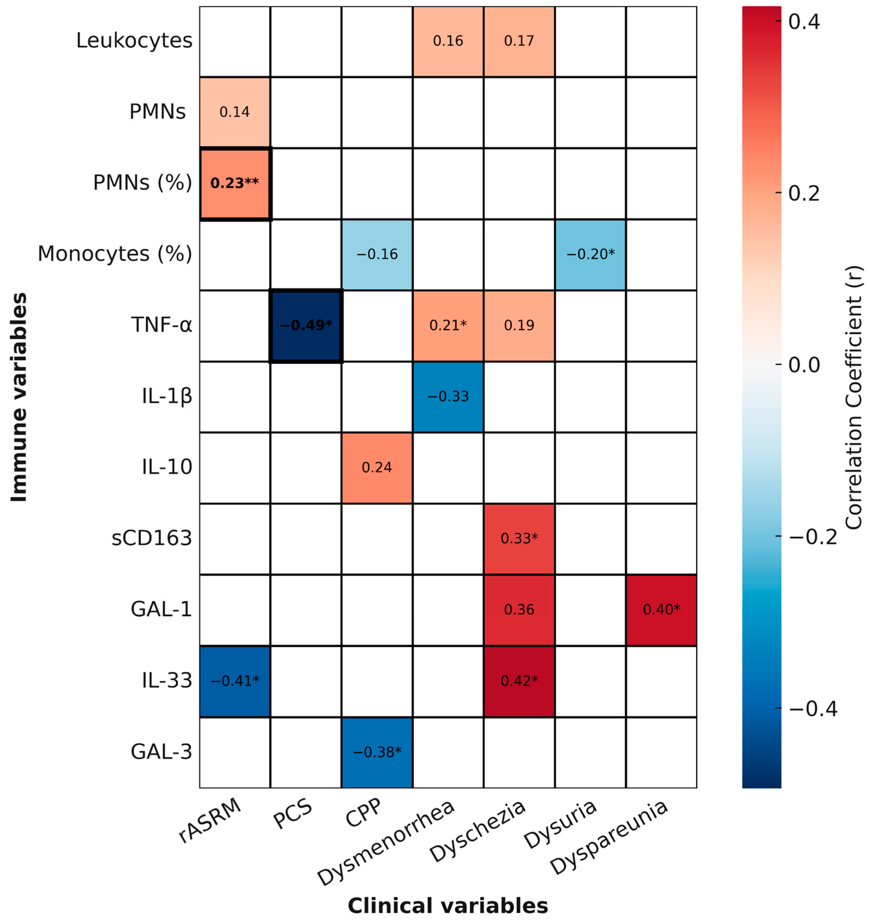 Exploratory correlation heatmaps were constructed to visualize relevant associations between systemic immune parameters (circulating leukocyte subsets and plasma inflammatory mediators) and clinical variables, including disease subtype, rASRM score, pain symptoms, PCS score, and tumor marker levels. Only variables with statistically significant (p < 0.05) or trend-level (0.05 ≤ p < 0.1) correlations were included in the heatmaps.