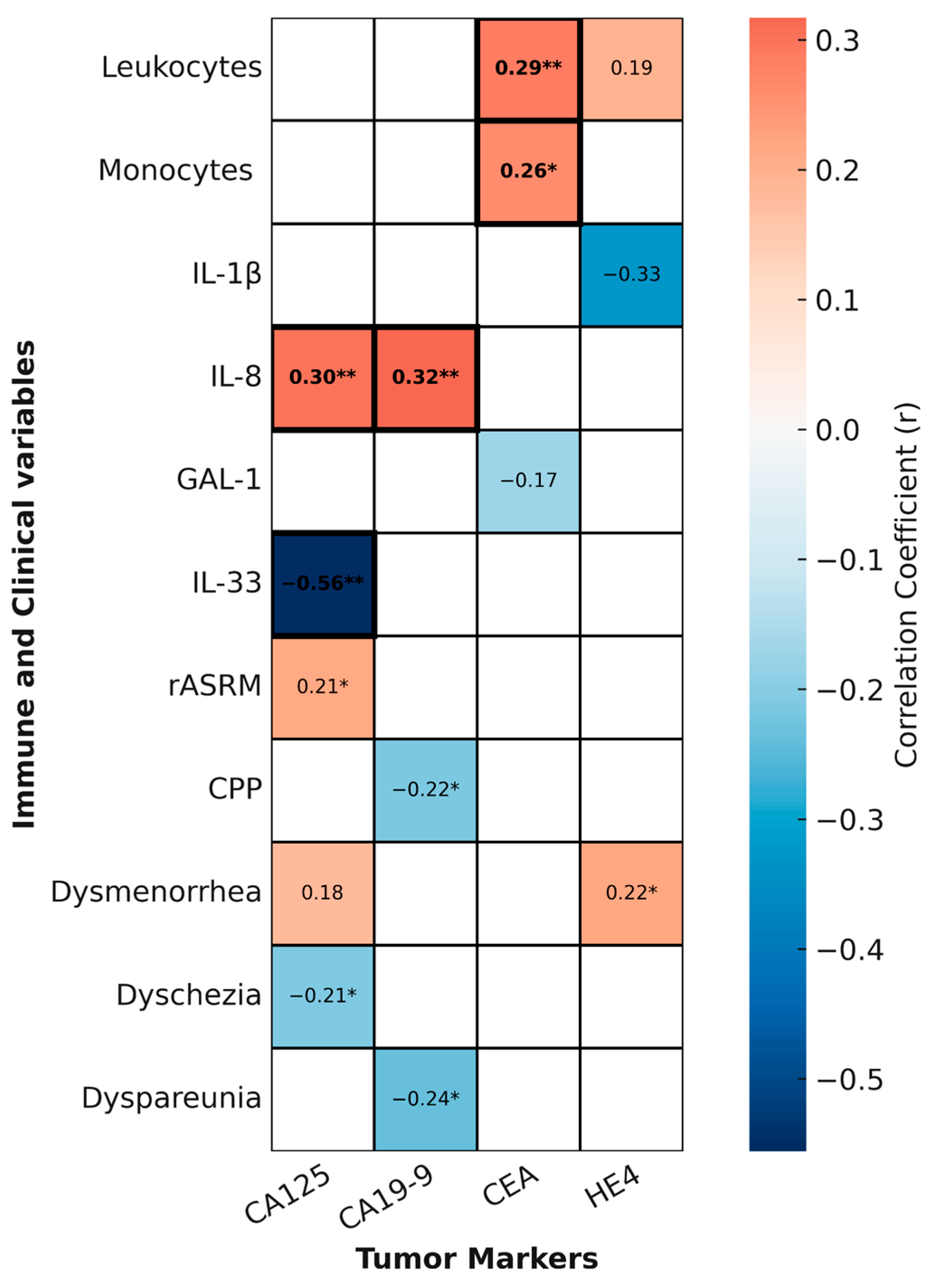 Although CA125 showed nominal correlations with rASRM score and dyschezia, and CA19-9/HE4 with pain, these associations did not survive FDR correction. By contrast, the correlations of CEA with leukocyte and monocyte counts, and of IL-8/IL-33 with CA125/CA19-9, underscore that tumor markers can capture subtle immunological activity beyond their classical role as oncologic biomarkers. This reinforces the concept that their value in endometriosis lies not as standalone markers but as part of integrated biomarker panels.