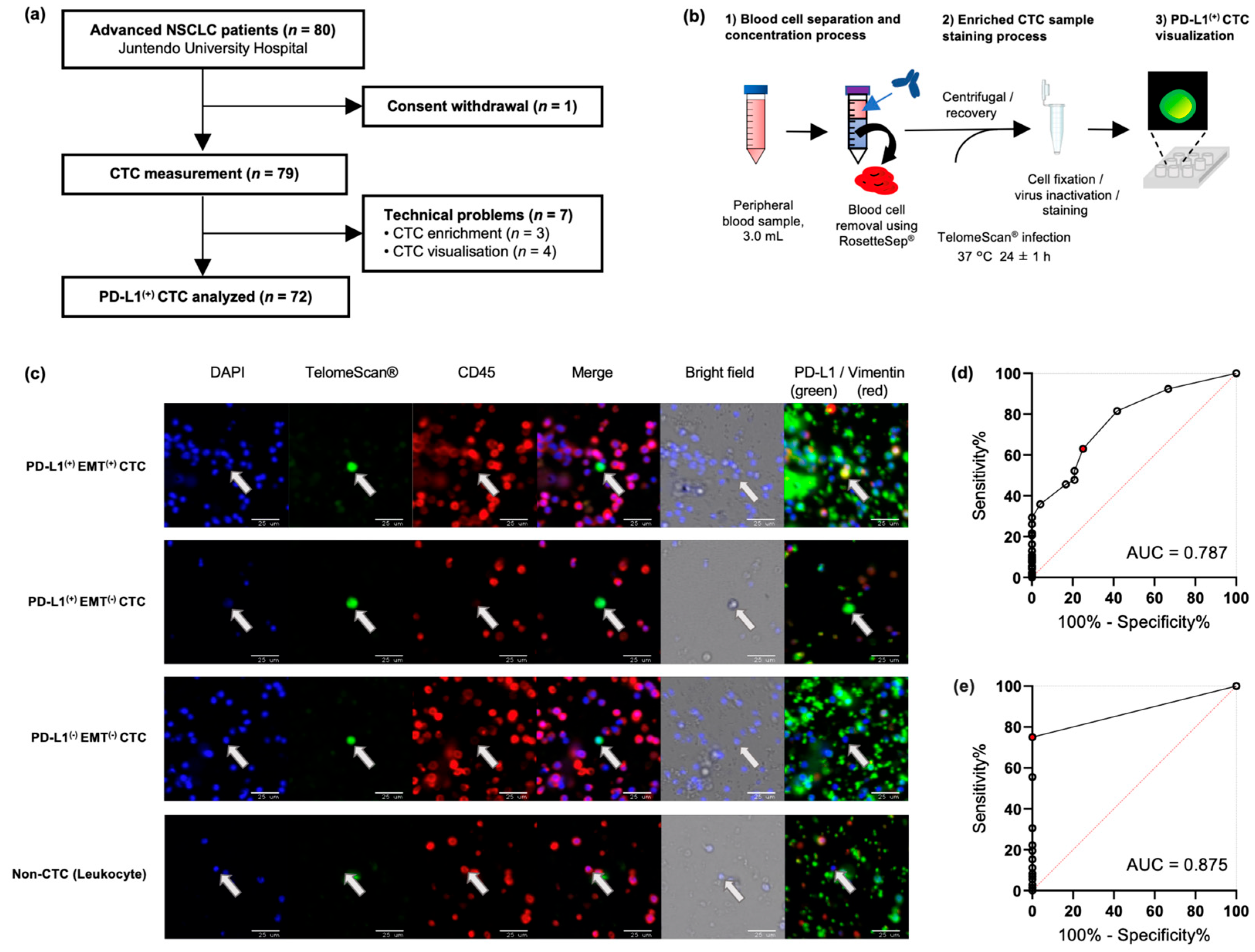 Figure 1. Highly sensitive circulating tumor cell subtype detection by TelomeScan®. (a) Study flow chart of advanced NSCLC patients (n = 80) in this cohort study. (b) Schematic consisting of three steps: (b1) concentration of circulating tumor cell (CTC)-enriched blood; (b2) incubation with TelomeScan® (OBP-401) and staining of phenotypic markers by immunocytochemistry; (b3) analysis of the CTC images and counts using a multi-fluorescent color microscope reader. (c) Representative TelomeScan-based multicolor images of CTC subtypes: PD-L1(+) EMT(+), PD-L1(+) EMT(−), PD-L1(−) EMT(−), and a leukocyte (non-CTC). EMT positivity was defined by vimentin expression. (d) Receiver operating characteristic (ROC) curve was used to determine the cut-off value for CTCs as 3 mL blood ≥ 3 CTCs diagnosis of non-small-cell lung cancer (NSCLC). The red dotted line indicates the point with the maximum Youden Index. The sensitivity and specificity of CTC analysis in the diagnosis of NSCLC were 63.0% and 75.0%, respectively. (e) ROC curve was used to determine the cut-off value for PD-L1(+) CTCs. The red dotted line indicates the point with the maximum Youden Index. Sensitivity and specificity of PD-L1(+) CTC analysis in the diagnosis of NSCLC achieved 75.0% and 100%, respectively. EMT, epithelial–mesenchymal transition; PD-L1, programmed death-ligand 1; AUC, area under the curve.