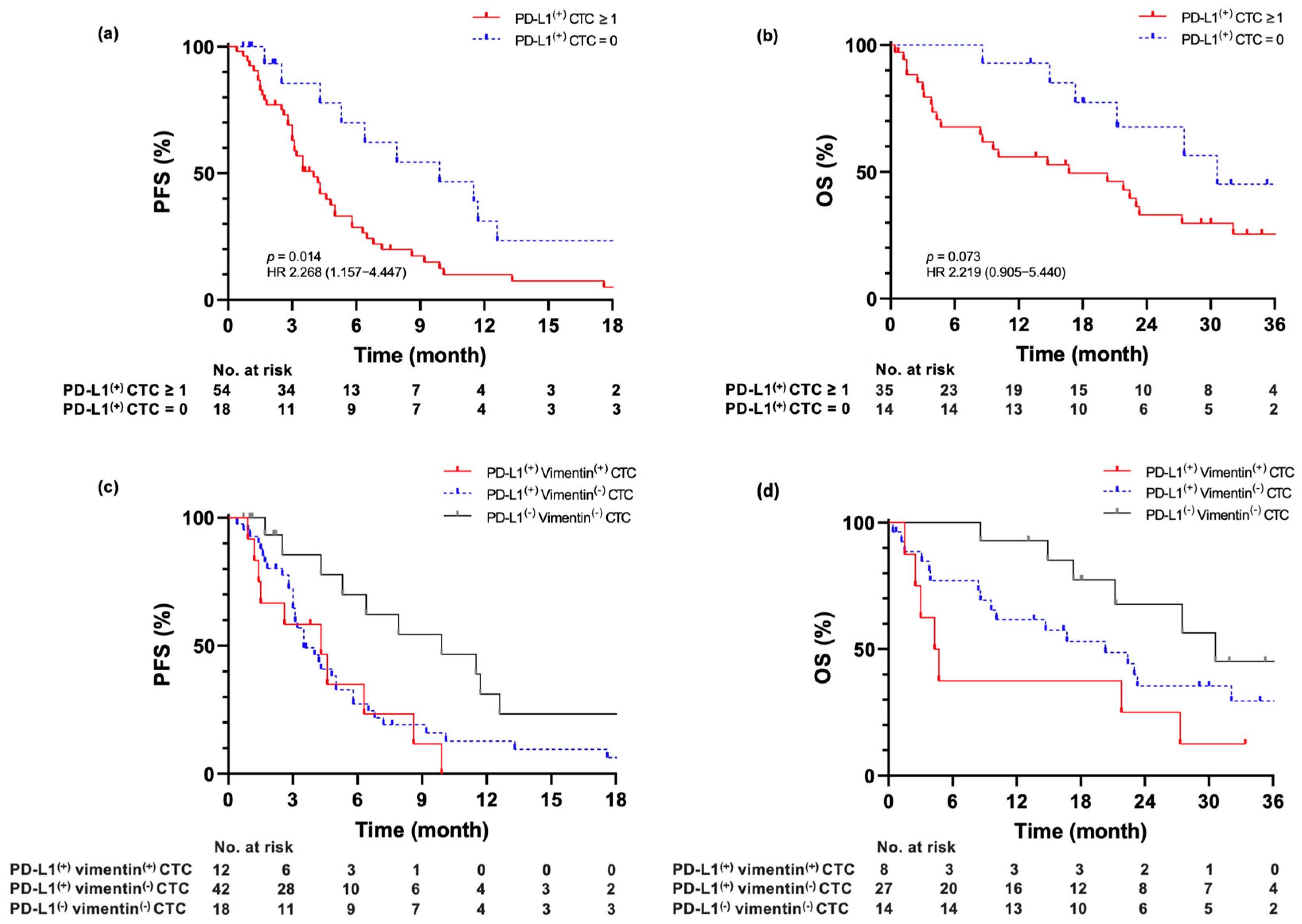 Figure 2. Association of circulating tumor cell measurement with progression-free survival and overall survival. (a,b) Comparison of patients with programmed death−ligand 1 (PD-L1)(+) CTCs/3.0 mL of blood: 0 vs. ≥1 CTCs. (c,d) Further stratification of patients according to EMT status: PD-L1(−) vimentin(−) CTCs, PD-L1(+) vimentin(−) CTCs, or PD-L1(+) vimentin(+) CTCs/3.0 mL of blood. p-values were calculated using the log-rank test. The hazard ratio (HR) was calculated using the Cox proportional hazards model.