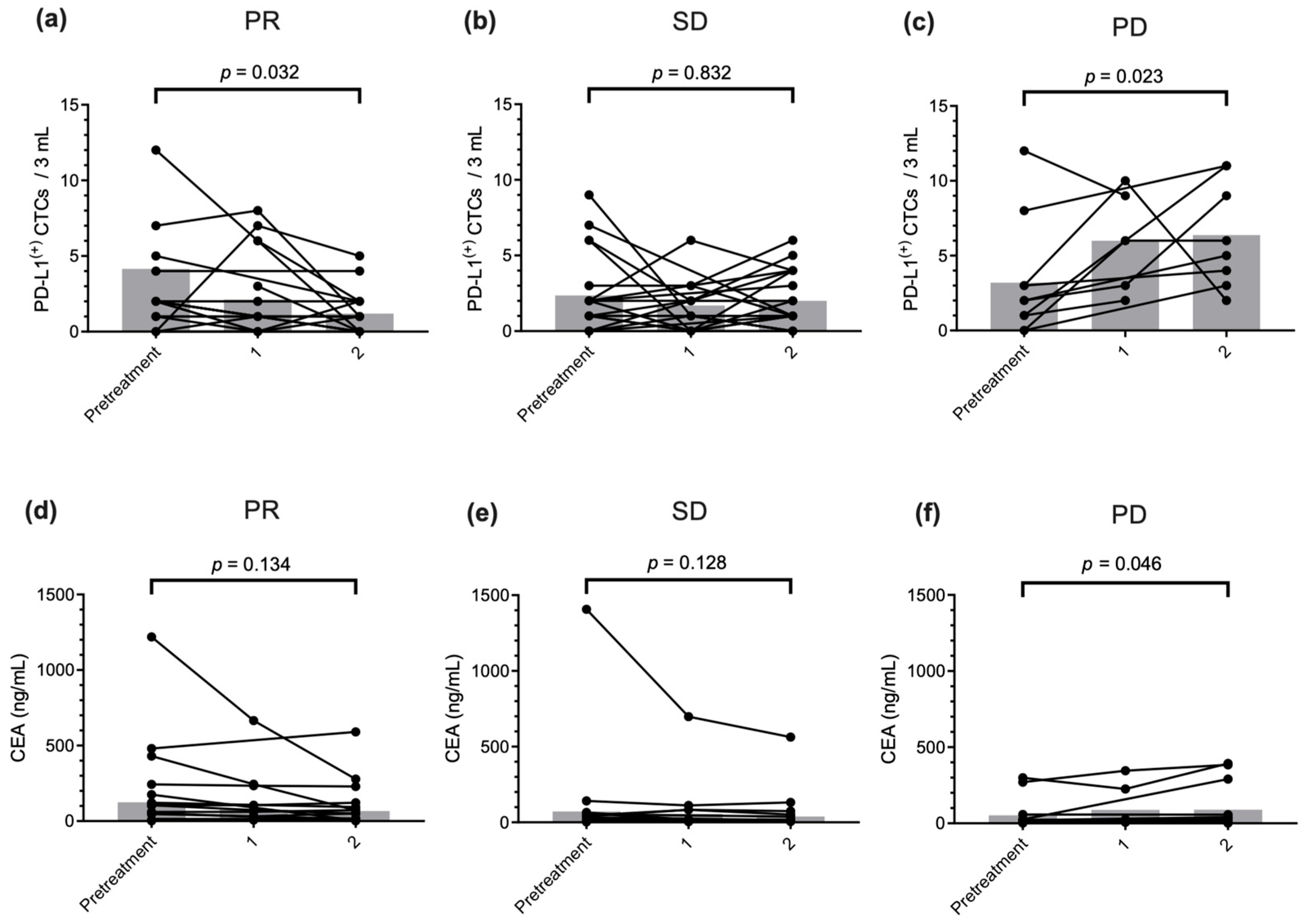 A significant decrease in the PD-L1(+) CTC counts from 4.2 (range: 0.0–34.0) to 1.2 (range: 0.0–5.0) cells was observed in patients with partial response (PR) after two cycles of treatment (p = 0.032, Figure 3a); however, it did not change in patients with stable disease (SD) (p = 0.832, Figure 3b). At baseline (before treatment), significantly increased PD-L1(+) CTC counts, from 3.2 (range: 0.0–12.0) to 6.2 (range: 2.0–11.0) cells, were observed in patients with PD after two treatment cycles (p = 0.023, Figure 3c). The change in serum carcinoembryonic antigen (CEA) levels in patients with PR and SD was not significant (PR: p = 0.134, SD: p = 0.128, Figure 3d,e). However, a significant increase in serum CEA levels was observed in patients with PD after two treatment cycles, which was similar to the change in the PD-L1(+) CTC count (p = 0.046, Figure 3f). The PD-L1(+) CTC counts were significantly elevated at all time points of PD compared with the pretreatment counts (p = 0.016, see Figure, Supplemental Data S5).
