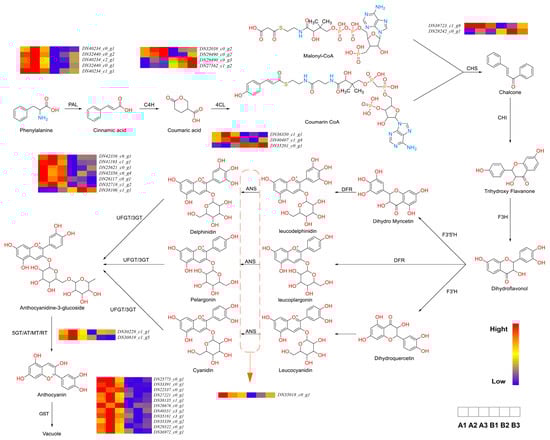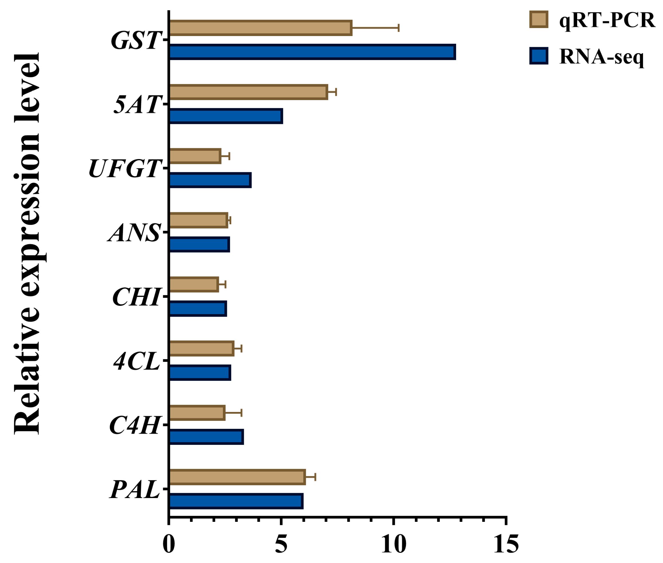 2.4. Expression Analysis of Enzymes Related to the Biosynthetic Pathway of Anthocyanins