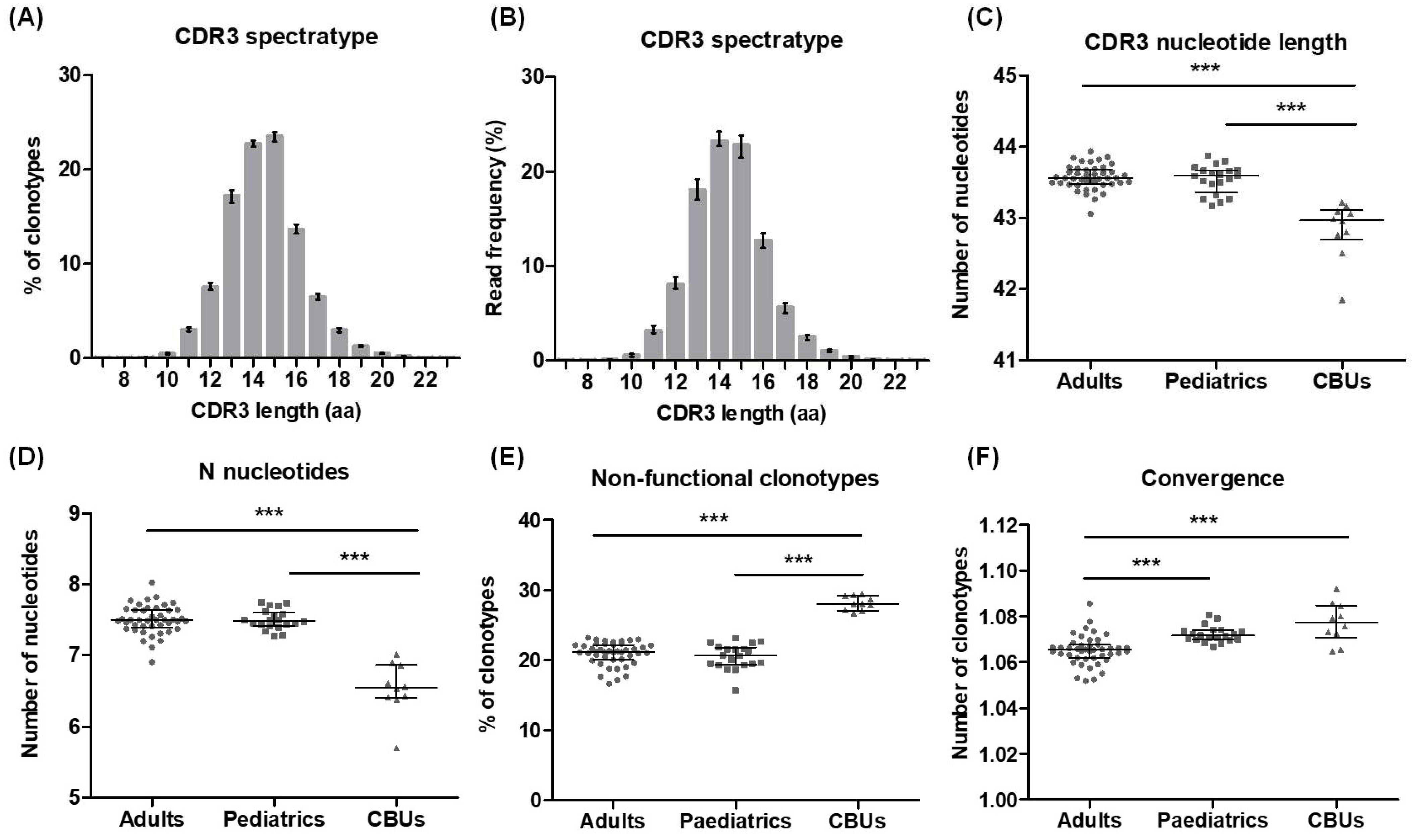 CDR3 nucleotide length | 43.56 (43.48–43.68) | 43.59 (43.36–43.67) | 42.97 (42.70–43.11) | 0.0001 |