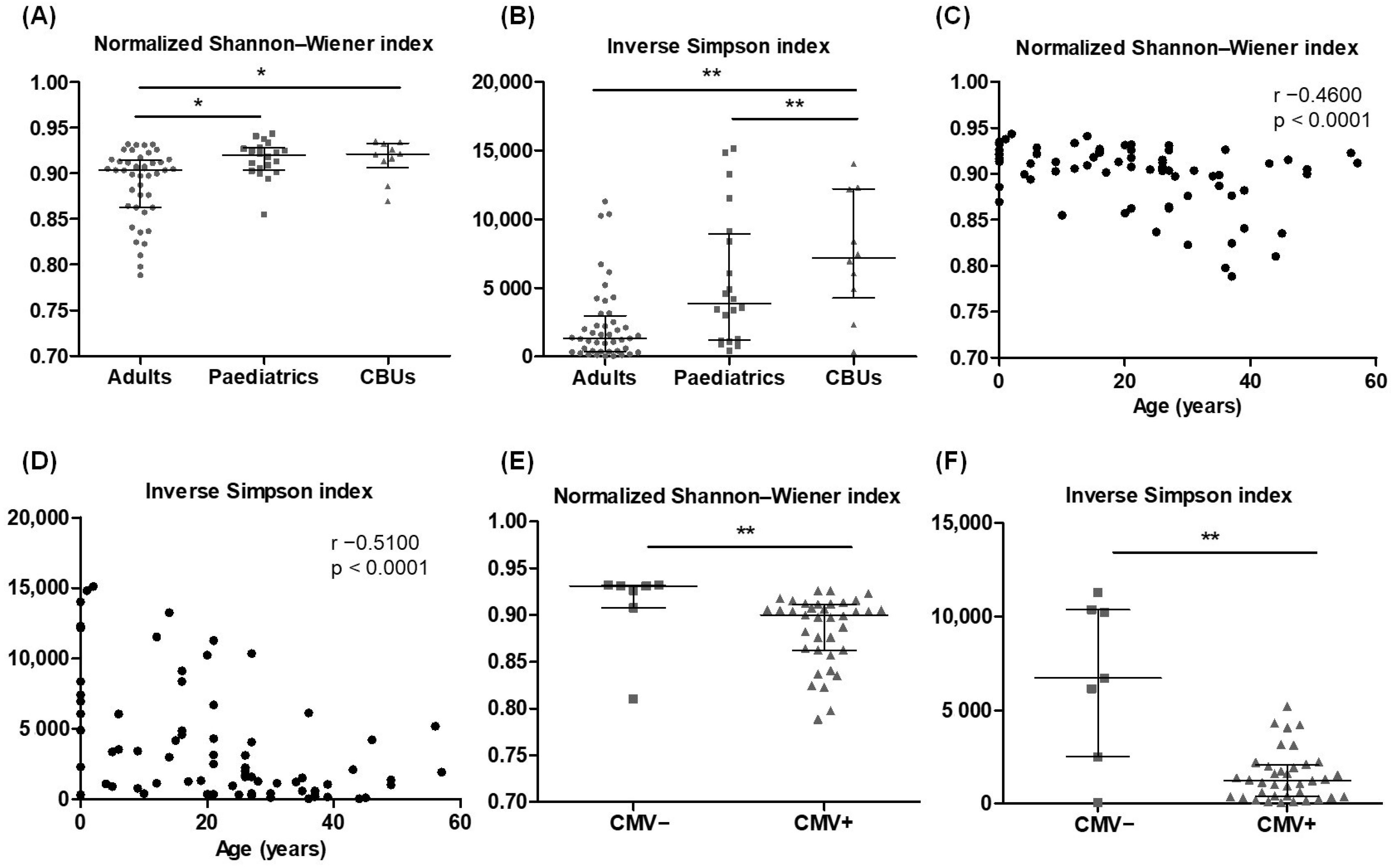 Inverse Simpson index | 1350 (375–2976) | 3860 (1175–8939) | 7190 (4257–12,196) | 0.0002 |