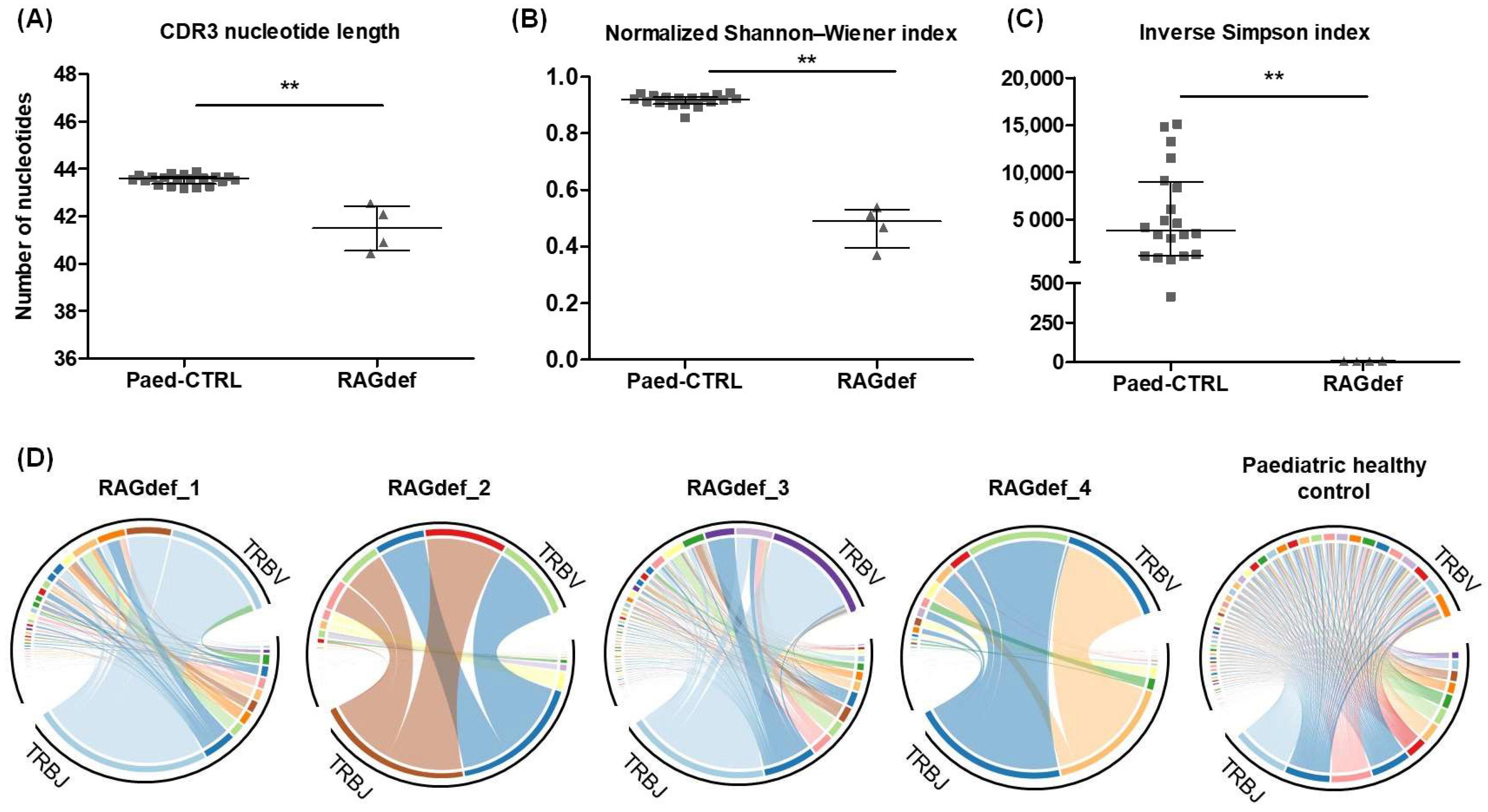 4.4. TCRβ Repertoire Profiling in Healthy Donors and Patients with RAG-SCID/CID