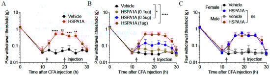Effects of HSPA1A on paw PWTs in CFA-induced inflammatory pain mouse models. (A): PWTs in CFA-induced mice after HSPA1A injection (n = 9). (B): PWTs in CFA-induced mice after different HSPA1A doses (n = 7). (C): PWTs in female and male mice after HSPA1A injection (n = 7). * p < 0.05, ** p < 0.01, *** p < 0.001, **** p < 0.0001, ns: not significant (p > 0.05).