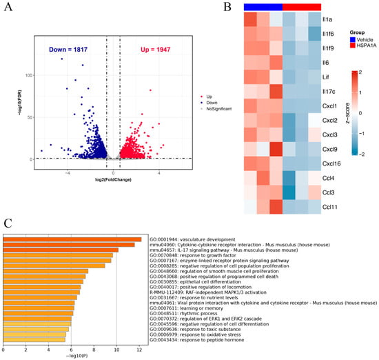 Transcriptomic RNA analysis identified 1947 upregulated and 1817 downregulated genes in HSPA1A-treated mice versus controls (Figure 2A). Further analysis of pro-inflammatory genes revealed significant downregulation of IL1a, IL6, CXCL1, and others (Figure 2B). Gene Ontology (GO) enrichment analysis demonstrated that downregulated genes were significantly enriched in biological processes including vascular development, cytokine–cytokine interaction, the IL-17 signaling pathway, RAF-independent MAPK1/3 activation, and regulation of the ERK1 and ERK2 cascade (Figure 2C).