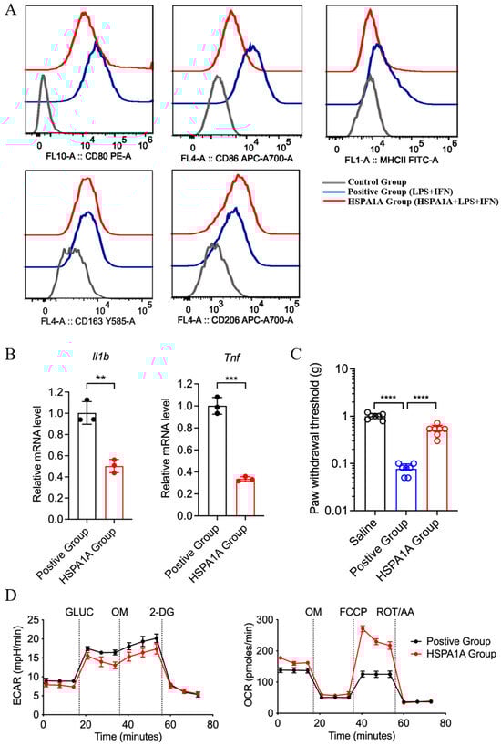 In vitro effects of HSPA1A on M1-polarized BMDMs. (A): Flow cytometry analysis of M1 (CD80, CD86, MHCII) and M2 (CD163, CD206) surface markers. (B): qPCR of Il1b and Tnf mRNA (n = 3). (C): PWT measurements (n = 7). (D): ECAR and OCR assessments (n = 6). ** p < 0.01, *** p < 0.001, **** p < 0.0001, ns: not significant (p > 0.05).
