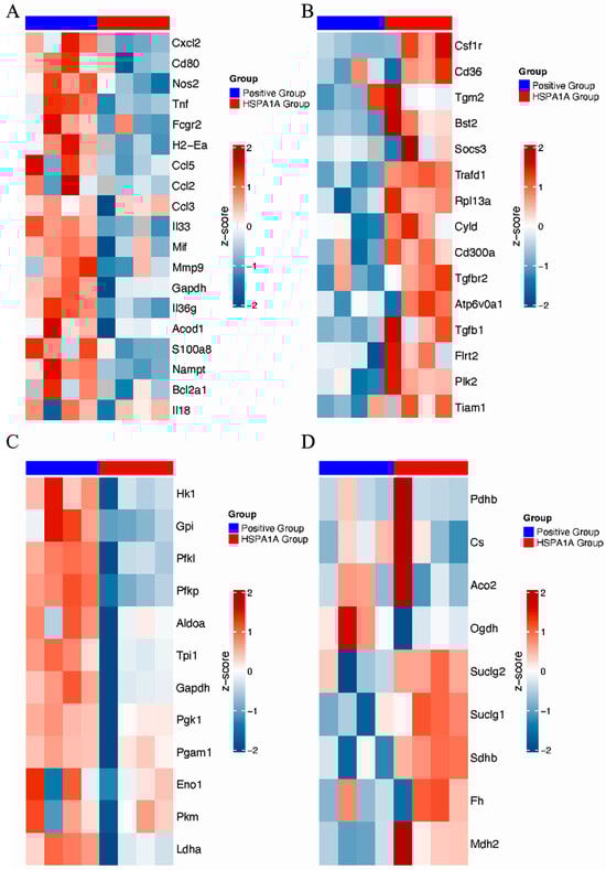 Proteomic analysis of HSPA1A-induced protein alterations in BMDMs. (A): Pro-inflammatory proteins. (B): Anti-inflammatory proteins. (C): Glycolysis-related proteins. (D): TCA cycle-related proteins. Protein expressions are shown as row-wise Z-scores (red, high; blue, low).
