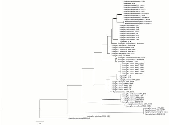 - Frisvad, J.C.; Hubka, V.; Ezekiel, C.N. Taxonomy of Aspergillus section Flavi and their production of aflatoxins, ochratoxins and other mycotoxins. Stud. Mycol. 2019, 93, 1–63. [Google Scholar] [CrossRef]