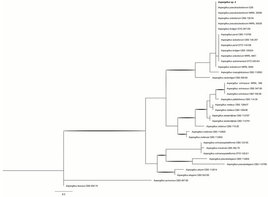 - Siqueira, J.P.Z.; Sutton, D.A.; Gené, J.; García, D.; Wiederhold, N.; Peterson, S.W.; Guarro, J. Multilocus Phylogeny and Antifungal Susceptibility of Aspergillus Section Circumdati from Clinical Samples and Description of A. pseudosclerotiorum sp. nov. J Clin. Microbiol. 2017, 55, 947–958. [Google Scholar] [CrossRef]