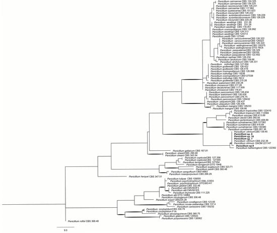 - Houbraken, J.; Kocsubé, S.; Visagie, C.M.; Yilmaz, N.; Wang, X.-C.; Meijer, M.; Kraak, B.; Hubka, V.; Bensch, K.; Samson, R.A.; et al. Classification of Aspergillus, Penicillium, Talaromyces and related genera (Eurotiales): An overview of families, genera, subgenera, sections, series, and species. Stud. Mycol. 2020, 95, 5–169. [Google Scholar] [CrossRef] [PubMed]