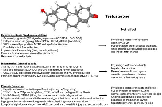 Effects of testosterone on the liver. Testosterone modulates all stages of metabolic dysfunction-associated steatohepatitis in a dose-dependent manner. The graph summarizes how natural androgen signaling protects the liver, whereas excessive use of anabolic-androgenic steroids can negate these benefits. The anti-steatotic pathway involves the activation of the androgen receptor (AR) by testosterone, which suppresses fat production (↓ SREBP-1c, FAS, ACC), promotes fatty-acid oxidation (↑ PPARα, CPT-1, AMPK), and enhances VLDL export (↑ MTTP, apoB), ultimately reducing triglyceride accumulation in the liver. In the anti-inflammatory pathway, testosterone decreases oxidative stress by activating Nrf2 to produce SOD, CAT, and GPx, inhibits NF-κB/TLR4 signaling, reduces recruitment of Kupffer cells and neutrophils, and lowers levels of pro-inflammatory cytokines (TNF-α, IL-6, IL-1β), thus preventing the progression to steatohepatitis. The anti-fibrotic pathway involves AR signaling in hepatic stellate cells, inhibiting activation and growth (↓ TGF-β1, p-Smad2/3, α-SMA, collagen I/III) while promoting matrix breakdown (↑ MMP-2/9, ↓ TIMP-1), which slows fibrosis development. Physiological testosterone levels protect the liver, whereas testosterone deficiency accelerates steatosis, inflammation, and fibrosis progression. Chronic high-dose anabolic-androgenic steroid (AAS) use can worsen these conditions. Abbreviations used: α-SMA, α-smooth muscle actin; ACC, acetyl-CoA carboxylase; AMPK, AMP-activated protein kinase; apoB, apolipoprotein B; CAT, catalase; CPT-1; carnitine palmitoyltransferase I; FAS, fatty acid synthetase; GPx, glutathione peroxidase; IL-1β, interleukin-1β; IL-6, interleukin 6; MMP, matrix metalloproteinase; MTTP, microsomal triglyceride transfer protein; NF-κB, nuclear factor ‘kappa-light-chain-enhancer’ of activated B-cells; Nrf2, Nuclear factor erythroid 2-related factor 2; p-Smad2/3, phosphorylated Smad 2 and Smad3; PPARα, Peroxisome proliferator-activated receptor-α; SOD, superoxide dismutase; SREBP-1c, sterol regulatory element-binding protein-1c; TGF-β1, transforming growth factor-β1; TIMP-1, tissue inhibitor of metalloproteinases-1; TLR4, toll-like receptor 4; TNF-α, tumor necrosis factor-α; VLDL, very low density lipoprotein.