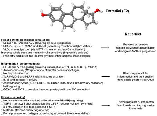 Estrogen (17β-estradiol, E2) provides comprehensive protection for the liver. This diagram illustrates the main ways in which estradiol (ER) counteracts the three stages of fatty liver disease. Anti-steatotic effects: ERα/ERβ signaling suppresses the lipogenic program (↓ SREBP-1c, FAS, ACC), enhances fatty acid oxidation and mitochondrial biogenesis (↑ PPARα, PGC-1α, CPT-1, AMPK), and promotes VLDL export (↑ MTTP, apoB), collectively reducing triglyceride accumulation. Anti-inflammatory effects: Estradiol reduces oxidative stress (Nrf2-driven induction of SOD, CAT, GPx), inhibits NF-κB, AP-1, TLR4, and inflammasome pathways, decreases Kupffer cell/neutrophil recruitment, and lowers pro-inflammatory cytokines (TNF-α, IL-6, IL-1β), preventing progression from simple steatosis to MASH. Anti-fibrotic effects: Direct ER-mediated inhibition of hepatic stellate cell activation (↓ α-SMA, TGF-β1, p-Smad2/3, CTGF), re-balancing extracellular-matrix turnover (↑ MMP-1/9, ↓ TIMP-1), and limiting collagen I/III deposition. Overall, estradiol slows or reverses hepatic steatosis, inflammation, and fibrosis, providing a basis for sex differences and estrogen-based treatments in MASLD/MASH. Abbreviations used: α-SMA, α-smooth muscle actin; ERα/β, estrogen receptor α/β; ACC, acetyl-CoA carboxylase; AMPK, AMP-activated protein kinase; apoB, apolipoprotein B; CAT, catalase; CPT-1; carnitine palmitoyltransferase I; CTGF, cellular communication network 2; FAS, fatty acid synthetase; GPx, glutathione peroxidase; IL-1β, interleukin-1β; IL-6, interleukin 6; MMP, matrix metalloproteinase; MTTP, microsomal triglyceride transfer protein; NF-κB, nuclear factor ‘kappa-light-chain-enhancer’ of activated B-cells; Nrf2, Nuclear factor erythroid 2-related factor 2; p-Smad2/3, phosphorylated Smad 2 and Smad3; PPARα, Peroxisome proliferator-activated receptor-α; SOD, superoxide dismutase; SREBP-1c, sterol regulatory element-binding protein-1c; TGF-β1, transforming growth factor-β1; TIMP-1, tissue inhibitor of metalloproteinases-1; TLR4, toll-like receptor 4; TNF-α, tumor necrosis factor-α.
