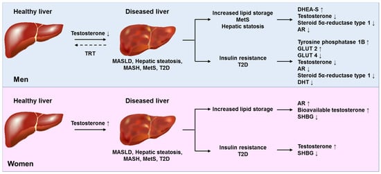 Molecular effects of testosterone on hepatic lipid metabolism. In males, low circulating testosterone levels are associated with hepatic pathology characterized by increased lipid storage, metabolic syndrome (MetS), hepatic steatosis, impaired insulin signaling, and subsequent type 2 diabetes (T2D) with numerous molecular changes. Testosterone replacement therapy (TRT) can partially restore these changes. In females, elevated (supraphysiological) testosterone levels are linked to liver pathology through enhanced lipid accumulation, disturbed glucose metabolism, and a higher risk of T2D. Abbreviations: AR, androgen receptor; DHEA-S, dehydroepiandrosterone sulfate; GLUT2/4, glucose transporters 2 and 4; MASH, metabolic dysfunction-associated steatohepatitis; MASLD, metabolic dysfunction-associated steatotic liver disease; MetS, metabolic syndrome; SHBG, sex hormone-binding globulin. This figure was adapted and simplified from a review article by Kasarinaite et al., providing additional insights on how sex hormones influence liver metabolism, immune responses, and the development of conditions such as MASLD, MASH, and fibrosis, with an additional focus on experimental models and cell-based modeling of MASLD [].