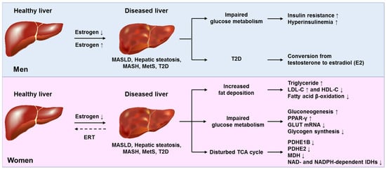 Molecular effects of estradiol on hepatic lipid metabolism. In males, impaired estrogen signaling predisposes to liver disease. Low estrogen worsens hepatic dysfunction by affecting glucose metabolism, while supraphysiological estrogen levels can contribute to MASLD in individuals with type 2 diabetes (T2D). In females, low levels of circulating estrogen are associated with liver issues, including increased fat storage and disruptions in glucose and tricarboxylic acid (TCA) cycle pathways. Estrogen replacement therapy (ERT) can help restore some of these changes. Abbreviations: ERT, IDH(s), isocitrate dehydrogenase(s); MASH, metabolic dysfunction-associated steatohepatitis; MASLD, metabolic dysfunction-associated steatotic liver disease; MDH, Malate dehydrogenase; MetS, metabolic syndrome; LDL-C, low-density lipoprotein cholesterol; HDL-C, high-density lipoprotein cholesterol; PPAR-γ, peroxisome proliferator-activated receptor-γ; GLUT, glucose transporter; PDHE1B, pyruvate dehydrogenase E1 beta; PDHE2, pyruvate dehydrogenase complex subunit E2. This figure was adapted and simplified from [].