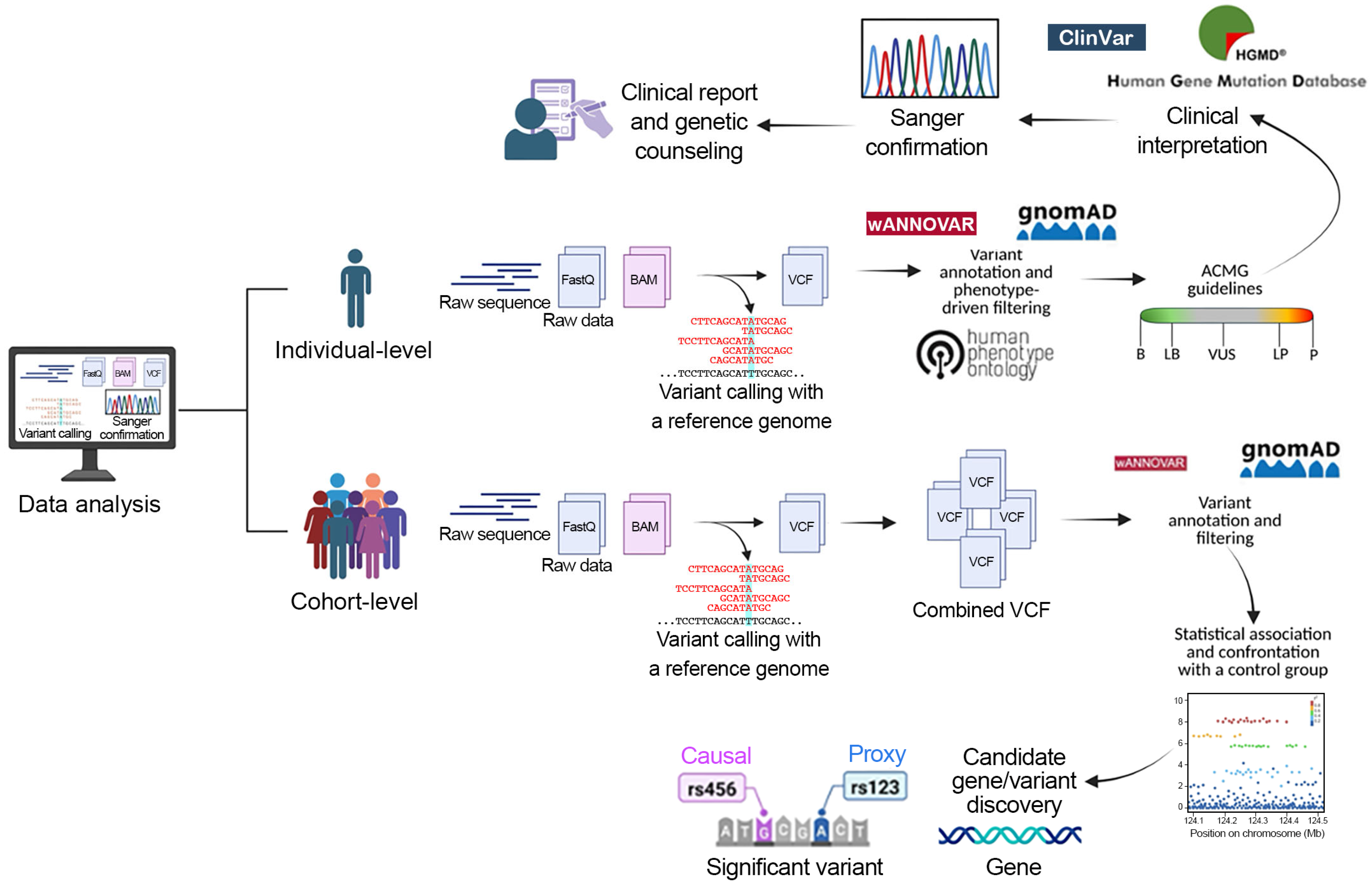 Bioinformatics | Alignment, variant calling, annotation | BWA, GATK, ANNOVAR | Pipelines, thresholds, filtering strategy |