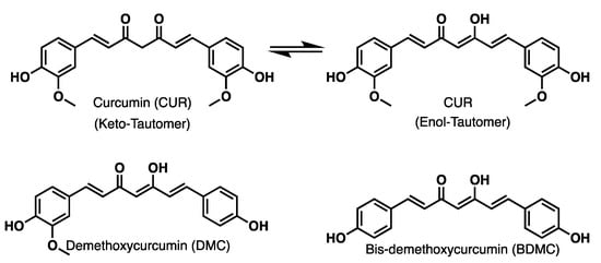 Turmeric, the natural E100 dye [1], belongs to the Zingiberaceae family [2,3]. Turmeric rhizome contains three secondary metabolites [4], namely the following curcuminoids [5]: curcumin (CUR), demethoxycurcumin (DMC), and bis-demethoxycurcumin (BDMC) [6,7], with structures shown in Figure 1. They are extracted from the natural source as a mixture and receive the name C-3 complex [8]. They are also considered the primary active metabolites of turmeric extract. However, both total curcuminoid content and individual ones in the rhizome depend on the region where they are harvested and from the plant genotype [9].