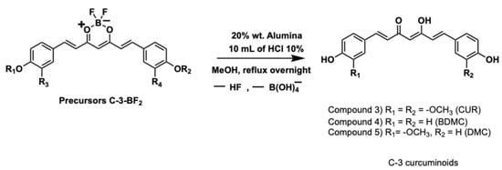 The recovery of the beta-diketone functionality was carried out using alumina and HCl as catalysts (for spectral characterisation, see Figures S17–S23 (Curcumin), Figures S24–S30 (Bis-demethoxycurcumin) and Figures S31–S37 (Demethoxycurcumin), respectively). This approach allowed obtaining the curcuminoids in relatively short reaction times (5 h), because the constant generation of acetic acid in the reaction medium (from hydrolysis of the acetyl group) contributes to the elimination of the BF2 group.