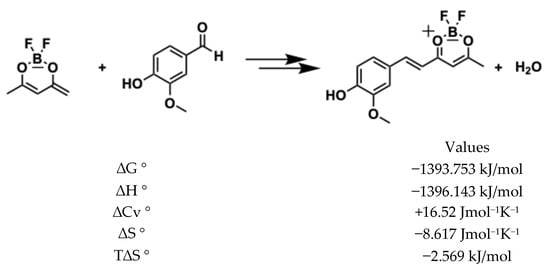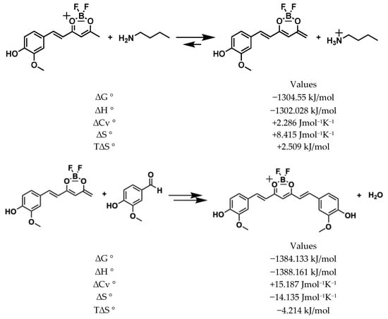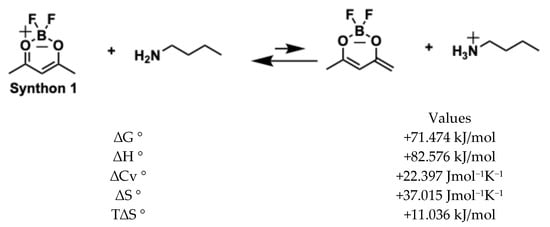The reaction of difluoroboronite of acetylacetone (synthon 1) with vanillin, catalysed by n-butylamine, occurs in two steps: first, synthon 1 donates an acidic proton to n-butylamine; secondly, the resulting anion acts as a nucleophile to attack the aldehyde group of vanillin (see Figure 6). According to thermochemical calculations (DFT: B3LyP basis: aug-cc-pvdz), the anion formation is slightly unfavourable (in the first step), having a positive ΔG° = +71.4 kJ/mol. However, the first reaction of nucleophilic substitution (monoaldolic condensation) is highly favourable and drives the whole reaction forward with a global result of ΔG° = −1393.753 kJ/mol.