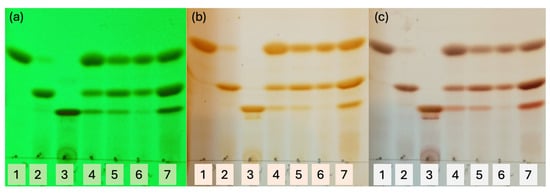 TLC with solvents CH2Cl2/Hexane/Methanol 65::30::5, three times of elution. (a) Under lamp UV 253 nm, (b) iodine chamber, (c) cerium (IV) sulphate. Spots: 1 = CUR, 2 = DMC, 3 = BDCM, 4 = extract from turmeric (Sigma-Aldrich), 5 = C-3 experimental condition (i), 6 = C-3 experimental condition (ii), 7 = C-3 experimental condition (iii).
