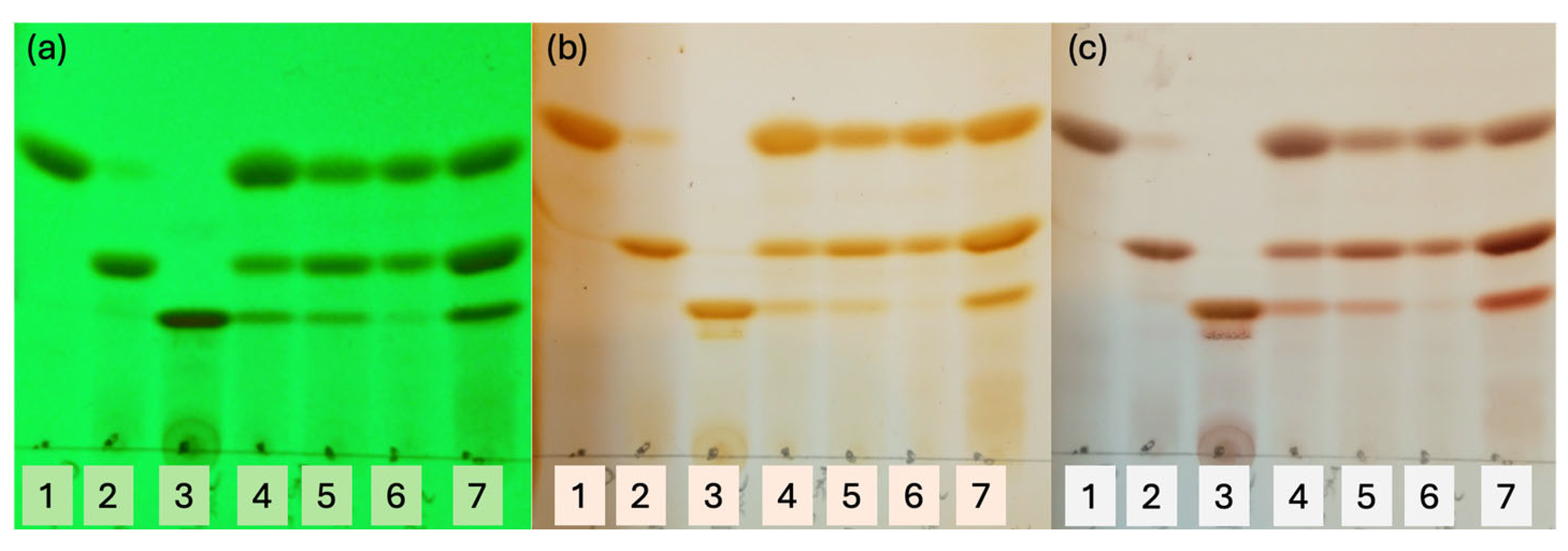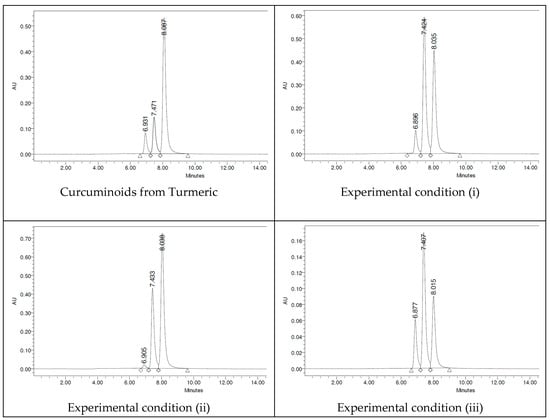 Analysing the lanes for spots 5, 6, and 7, a greater intensity of CUR (spot 6) is observed only in the experimental conditions (ii). These results suggest that the chemical function of aldehydes (phenol or acetyl) is not influencing the final concentrations of curcuminoids because almost the same concentration was obtained when HPLC analysed the samples following the order DMC > CUR > BDMC for experimental conditions (i) and (iii).
