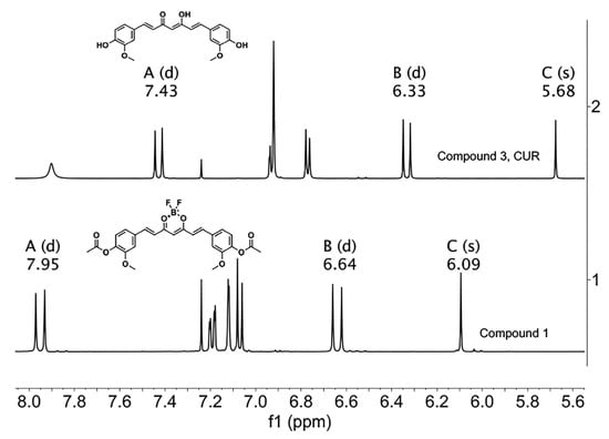 The 1H-NMR spectrum of the BF2 precursor shows chemical shifts to higher frequencies with respect to the CUR [29]. Methine protons occur at 6.09 ppm for precursor (compound 1) and 5.09 ppm for CUR (compound 3). The doublet that corresponds to the vinyl protons of the precursor at 7.95 ppm (ββ) and 6.64 ppm (αα) showed higher shifts, whereas the vinyl protons of CUR showed lower shifts at 7.43 ppm (ββ) and 6.33 ppm (αα), as depicted in Figure 10.