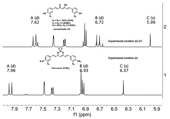 1H-NMR spectra of (1) C-3 precursors-BF2 and (2) C-3 Curcuminoids from experimental condition (ii). The letters A, B and C correspond to ββ, αα, and C methine protons, respectively. (Acetone-d6, 400 MHz).