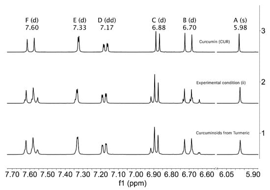 1H-NMR spectra of aromatic regions of curcuminoids: 1, curcuminoids from natural turmeric; 2: mixture of curcuminoids from experimental condition (ii); and 3: synthetic curcumin, 3. The regions marked with letters correspond to: F to ββ, E, D and C to aromatics, B to αα, and A to methine protons for the three curcuminoids, respectively. (Acetone-d6, 400 MHz).