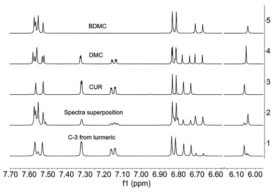 We carried out a superposition of the 1H-NMR individual spectra of CUR, DMC, and BDMC in pure forms (Figure 13), and the resulting spectrum does not represent the signal patterns obtained when comparing the spectra of turmeric (natural) or C-3 mixture (synthetic), possibly caused by mutual anisotropic interactions from each curcuminoid.