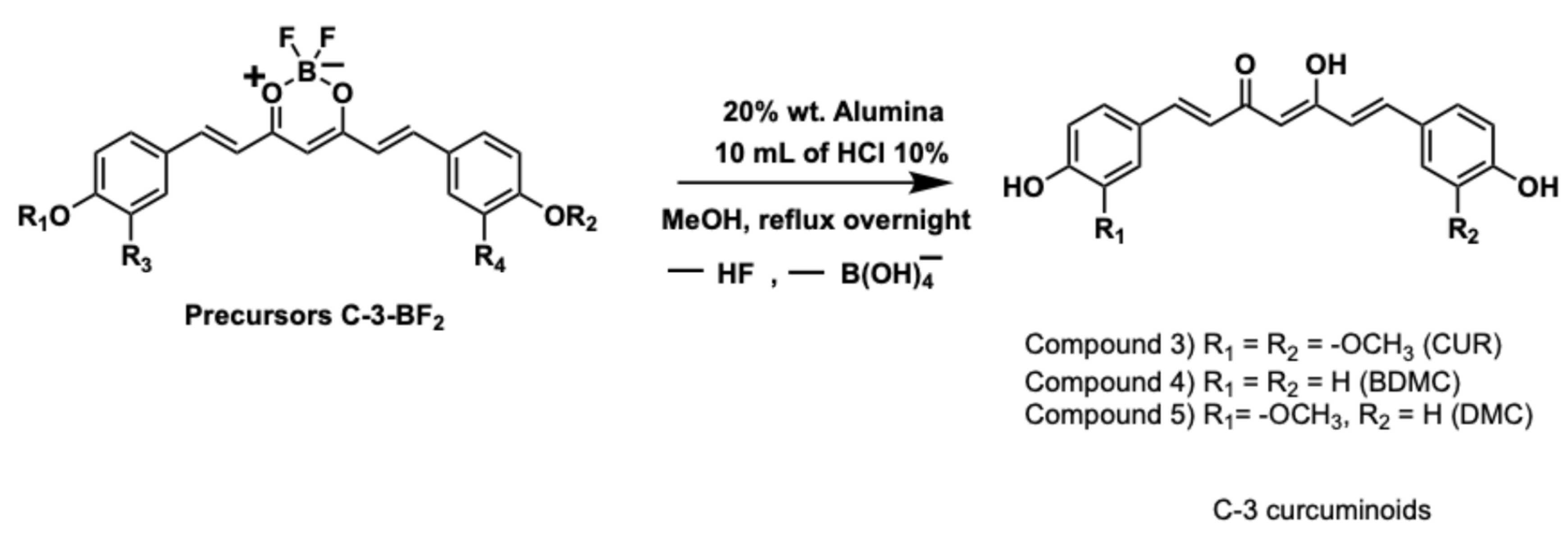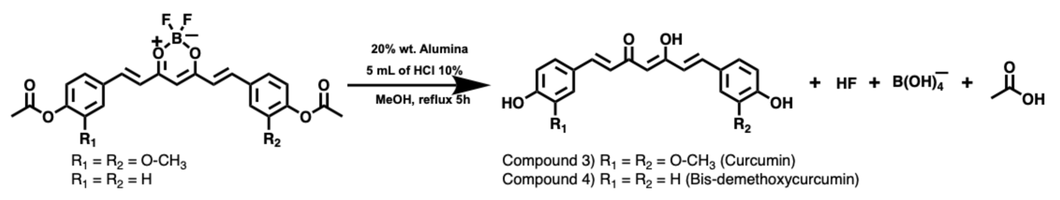 A methodology like the one reported previously was used and is described here. In a 500 mL round flask, 10 g of Curcuminoids-BF2 symmetric (compound 1 or 2) was dissolved in 400 mL of methanol (MeOH), 20% weight of Al2O3 (catalyst) and 10 mL of HCl were added to the solution. The reaction was left for 5 h under magnetic stirring at reflux. The reaction was quenched by filtration using a sintered glass funnel packed with celite. MeOH was evaporated in vacuum, and the reaction crude was extracted with 200 mL of EtOAc (Ethyl acetate) and water (3 × 100 mL). The organic phase was dried under Na2SO4 and concentrated in a vacuum to afford the curcuminoid product, which was purified by flash chromatography using Hexane-EtOAc 70:30, With this methodology, curcumin and bis-demethoxycurcumin were obtained with yields of 55% (curcumin, compound 3) and 70% (bis-demethoxycurcumin, compound 4).