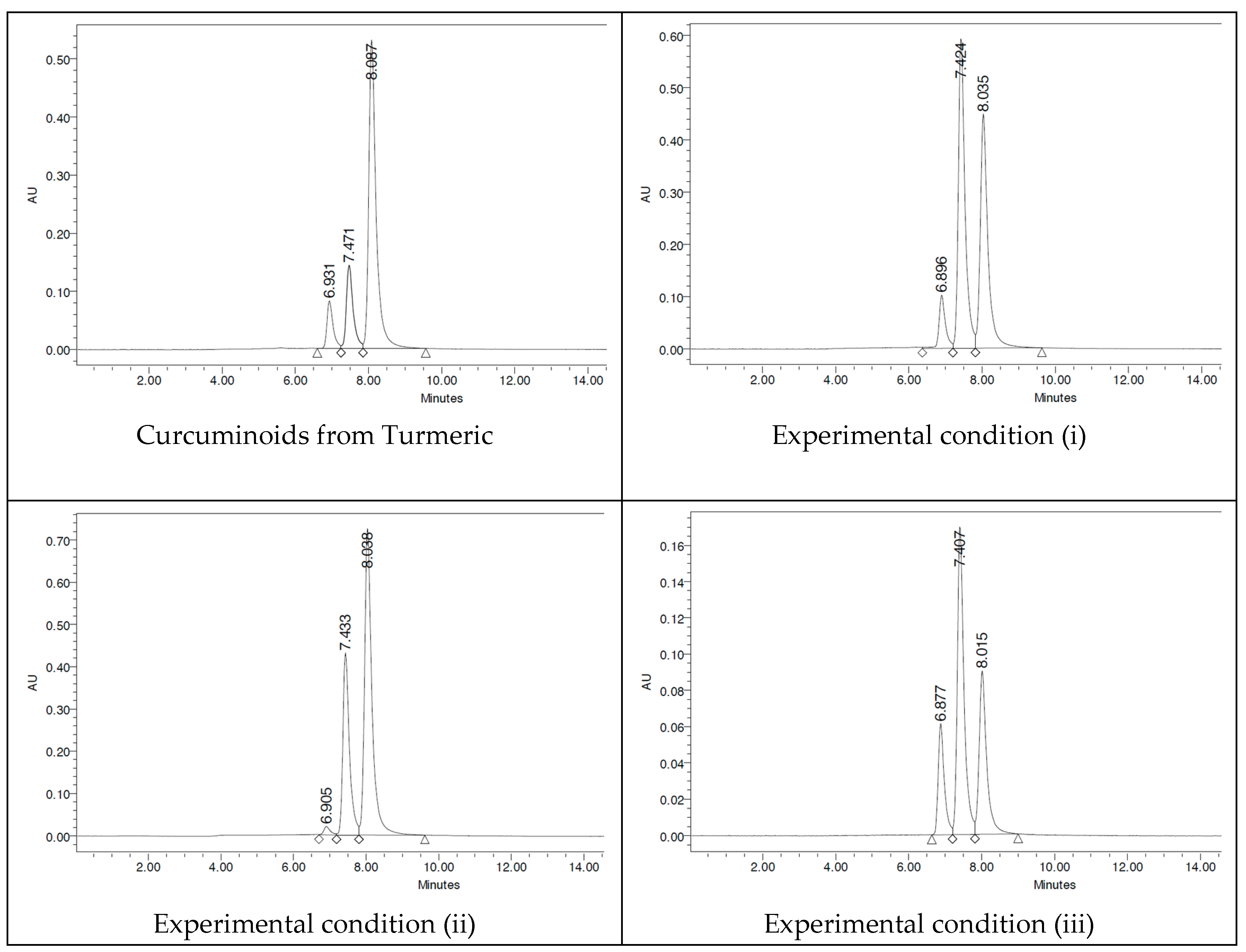 The HPLC chromatograms were carried out with a mixture of three solvents (acetonitrile/water/orthophosphoric acid (0.02%)). In the HPLC studies, it can be observed that synthetic curcuminoids in the form of mixtures show the exact retention times as the turmeric curcuminoid extract, occurring naturally. Indeed, synthetic samples adequately cover all aspects of the curcuminoids of natural origin. The HPLC chromatograms presented in