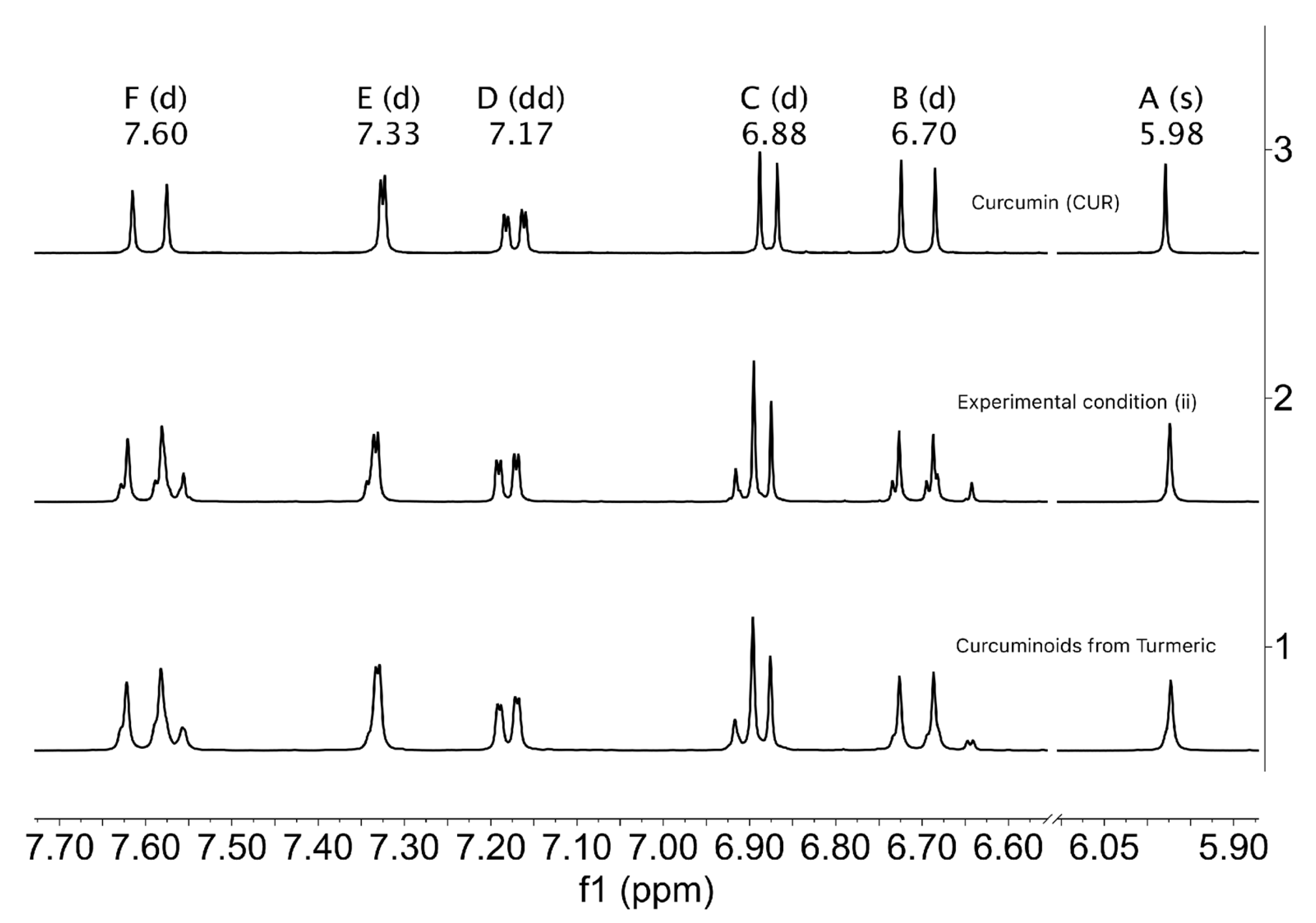 The NMR spectrum at 400 MHz in Acetone-d6 does not distinguish the three different protons expected for each synthetic curcuminoid, at ca. δ5.98 ppm for the central methines. Furthermore, signals of aromatic proton in regions (6.6 ppm–7.7 ppm) correspond to the mixture of the three curcuminoids, while signals for vinyl’s protons (ββ) and (αα) appear at 7.60 ppm and 6.70 ppm, respectively.