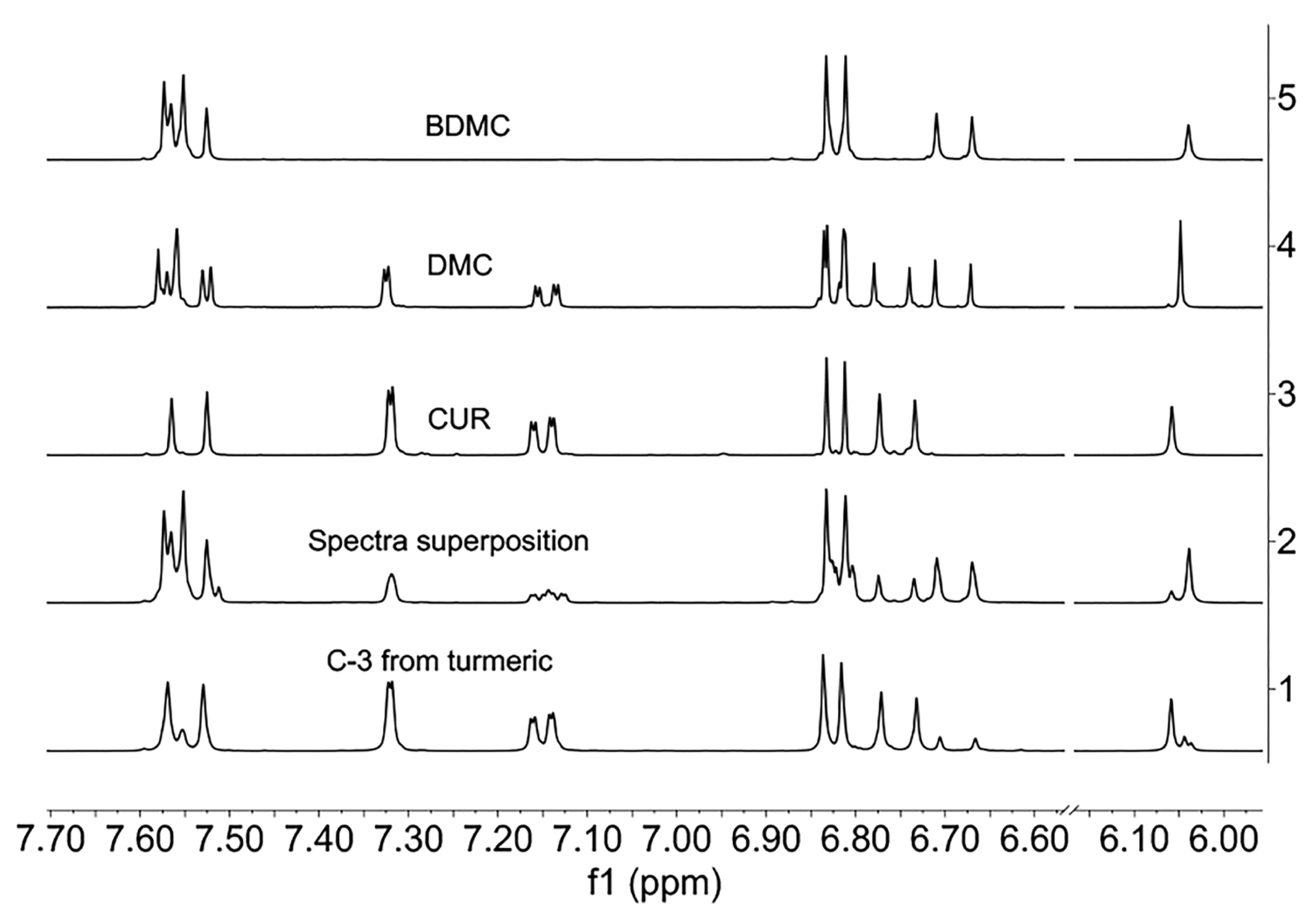 Figure 13). Some additional signals of low intensity correspond to small impurities present. The signals of CUR stand out clearly, while the other minor curcuminoids correspond to DMC and BDMC. Furthermore, the close structural resemblance explains the difficulty of chromatographic or crystallographic separation when the three components (CUR, DMC, and BDMC) come from a mixture of co-crystallised powders.