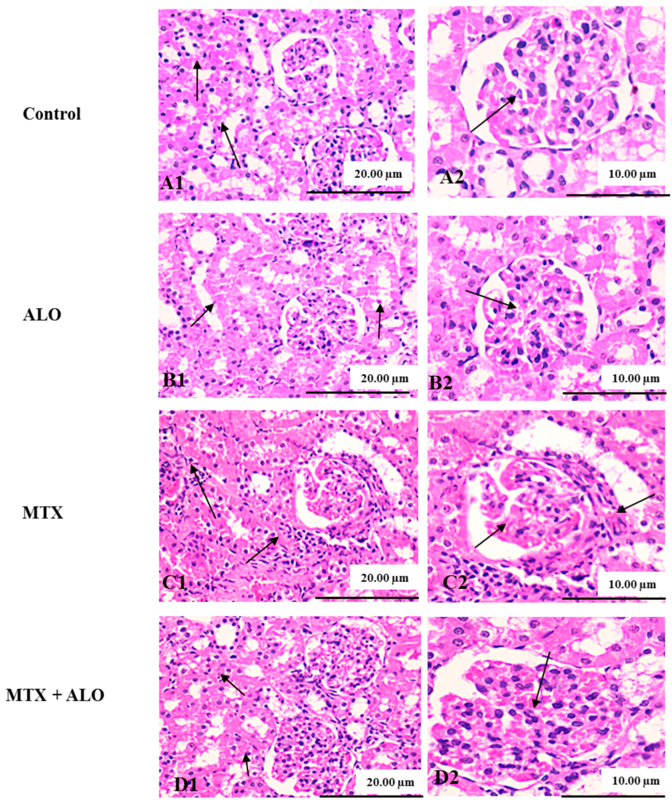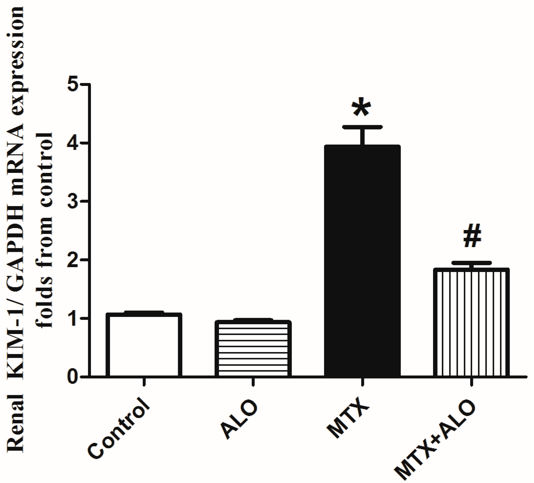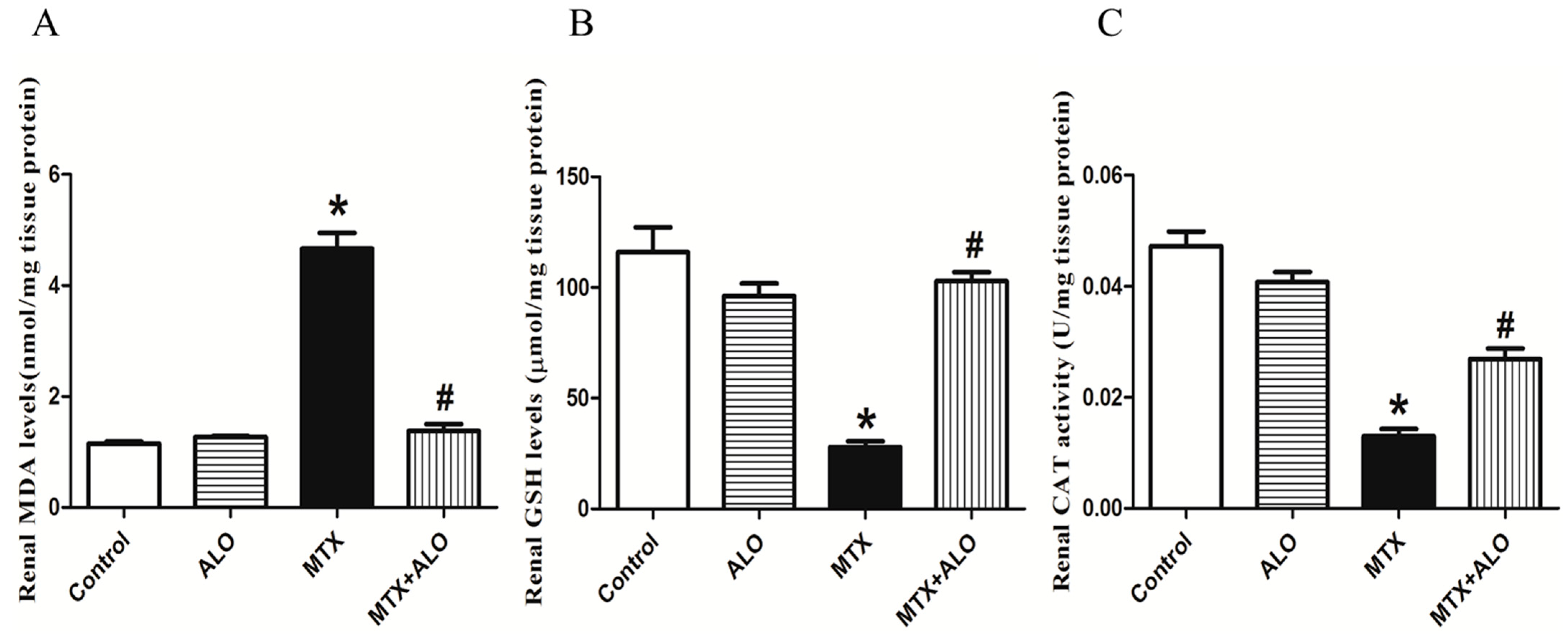 2.3. Effect of ALO on Renal MDA, GSH, and Catalase in MTX-Induced Renal Damage
