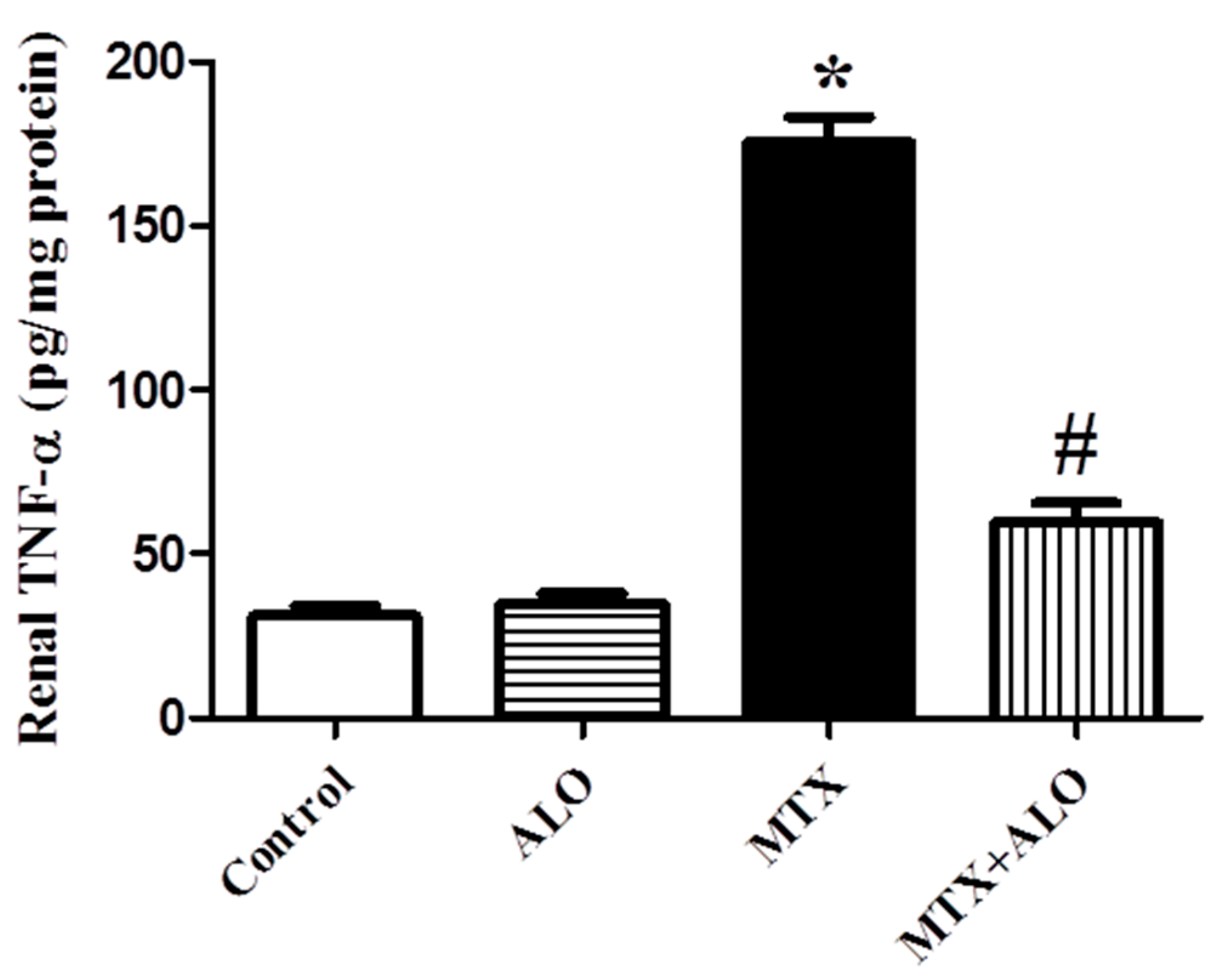 2.5. Effects of ALO on Renal Inflammatory Mediator (TNF-α) Protein Expression