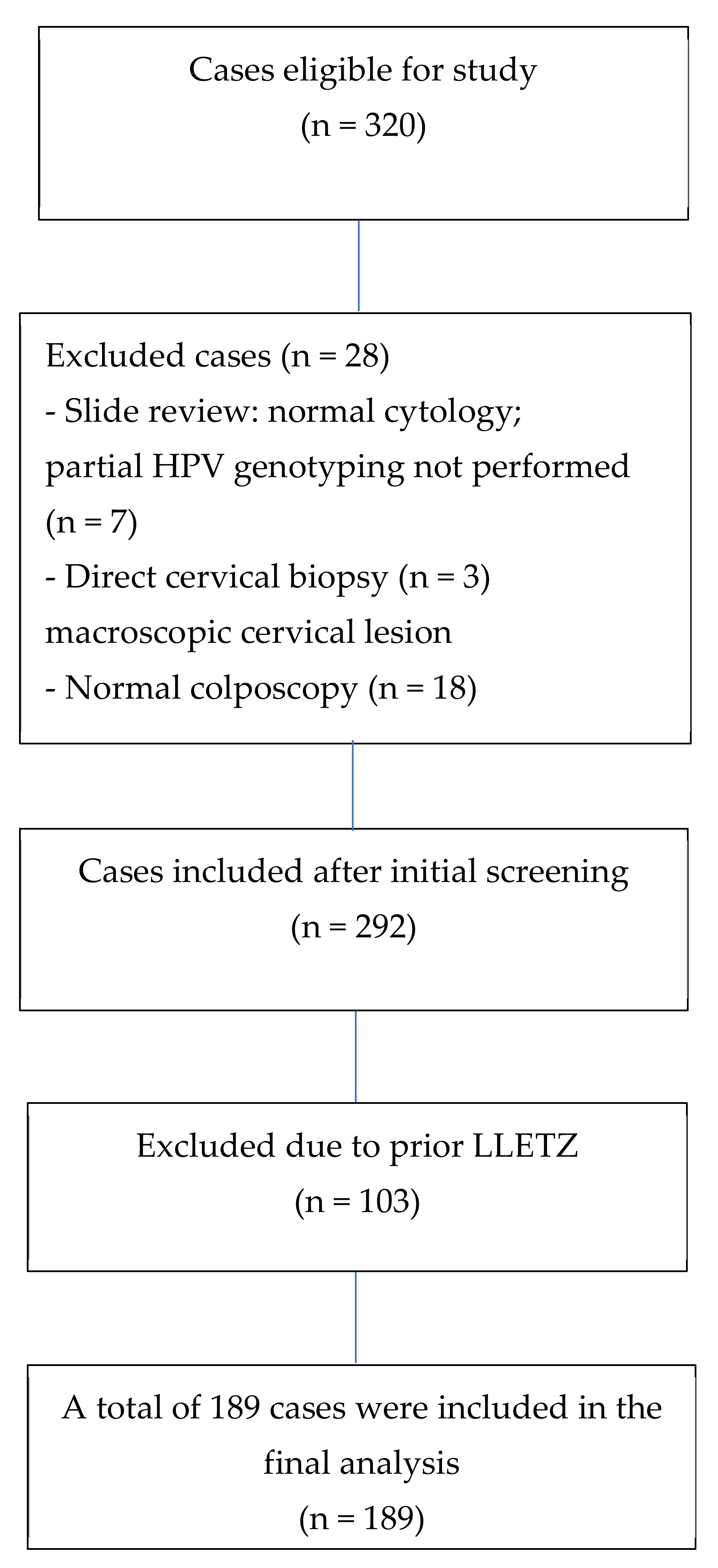 The study included women aged 20 to 80 years with abnormal cytological findings—including Atypical Squamous Cells of Undetermined Significance (ASC-US), Atypical Squamous Cells that cannot exclude HSIL (ASC-Hs), atypical glandular cells (AGCs), Low-Grade Squamous Intraepithelial Lesions (LSILs), or High-Grade Squamous Intraepithelial Lesions (HSILs)—who underwent partial HPV genotyping with the Cobas 4800 assays [14]. This assay detects genotypes 16 and 18, as well as 12 additional high-risk types (31, 33, 35, 39, 45, 51, 52, 56, 58, 59, 66, and 68). All participants subsequently underwent colposcopy with directed biopsy. Patients with a history of CIN treatment, cervical cancer, or known immunosuppression were excluded because of their higher and biologically distinct risk of HPV persistence and disease progression (Figure 1).