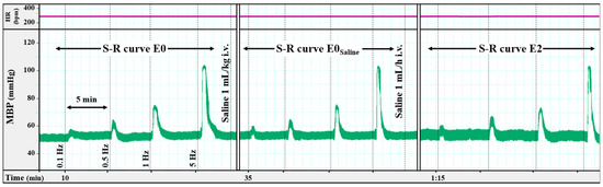 When the animals were in a stable hemodynamic condition for at least 10 min, baseline values of MBP and HR were recorded. Afterwards, vascular sympathetic nerves were electrically stimulated as previously stated: 15 ± 3 V, monophasic pulses of 1 ms, for 25 s at increasing frequencies (0.1, 0.5, 1, and 5 Hz). An interval of approximately 5 min was maintained between each frequency. The responses obtained showed increases in MBP (∆MBP), without significant changes in HR, and basal MBP was restored immediately after interruption of the stimulation. The S-R curve E0 was achieved in 20 min [6,7,8,18,32].